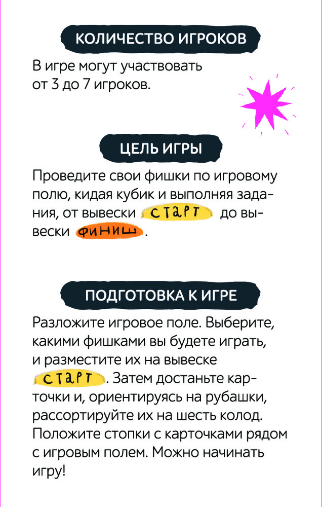 Игра невероятная, сделана из качественного материала, игровое поле не хлипкое, очень плотное. Оформление на потрясающем уровне, хочется не выпускать из рук и рассматривать каждую карточку, да и само поле. Играть легко, задания простые, и главное подходит для большой семьи (могут играть сразу 7 человек)! Детям ещё не показывала, но уже сейчас представляю, что это будет полный восторг! Хоть цена и не из низких, но эта игра того стоит. Для игр семьёй или с друзьями самое то, очень рекомендую.