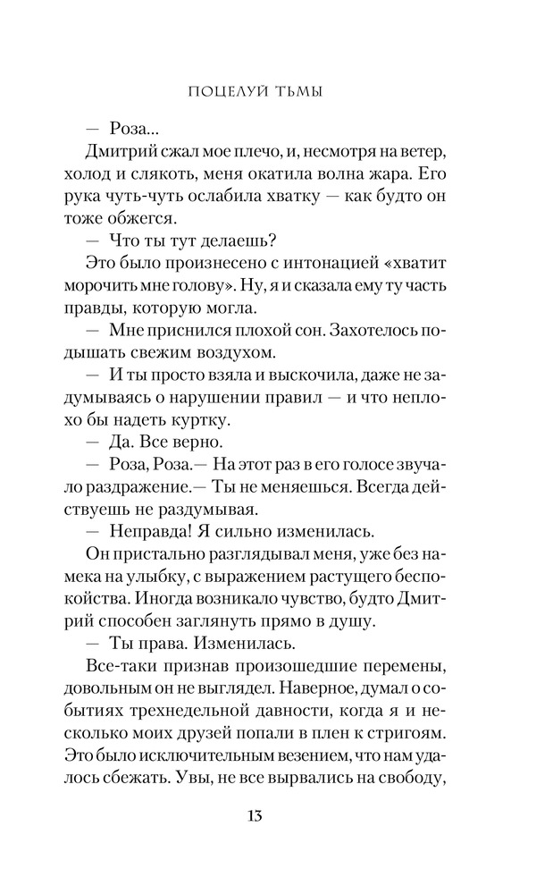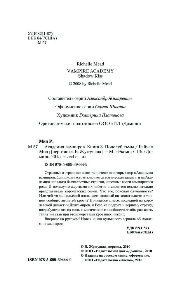 Академия вампиров. Книга 3: Поцелуй тьмыВ данный момент этот товар отсутствует в продаже. Возможно, у нас найдется аналогичный или похожий товар здесь. Серия: Сумерки Странные и страшные вещи творятся с некоторых пор в Академии вампиров. Слишком часто отключается магическая защита, и на Академию нападают безжалостные стригои, извечные враги вампирского рода. И почему-то жертвами их набегов становятся исключительно представители королевских семей. Что это, роковая случайность? Или чей-то дьявольский план, рассчитанный на захват власти в тайном сообществе детей крови? Принцессе Лиссе, последней из королевской династии Драгомиров, и Розе, ее подруге и верному стражу, потребуются все их силы и магические способности, чтобы разгадать тайну, не став при этом жертвами кровавых интриг. Впервые на русском! Новая книга культового сериала об Академии вампиров. |