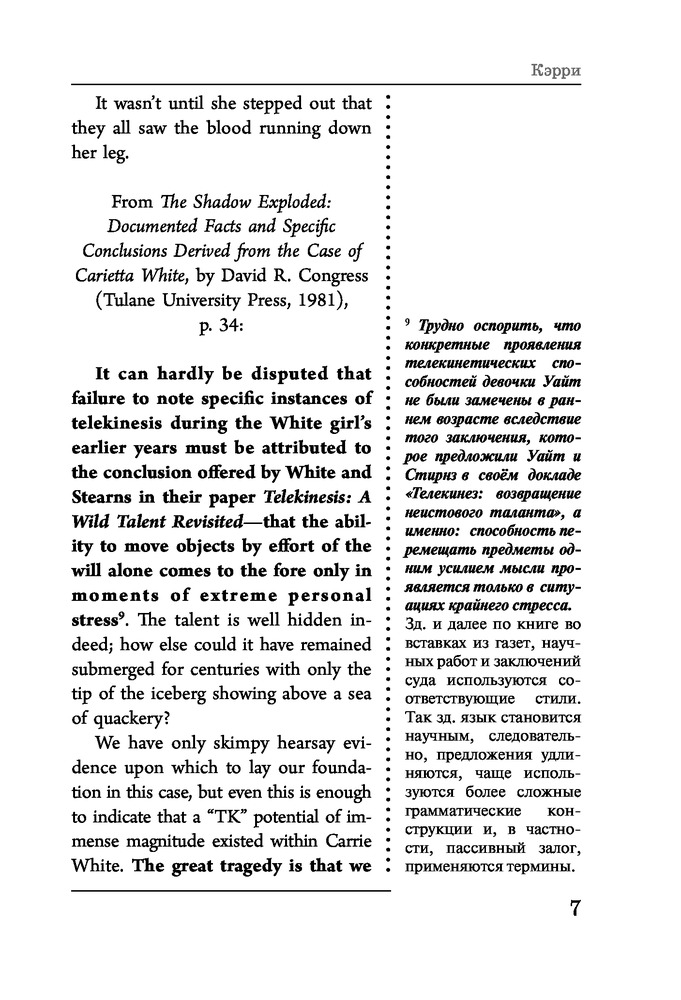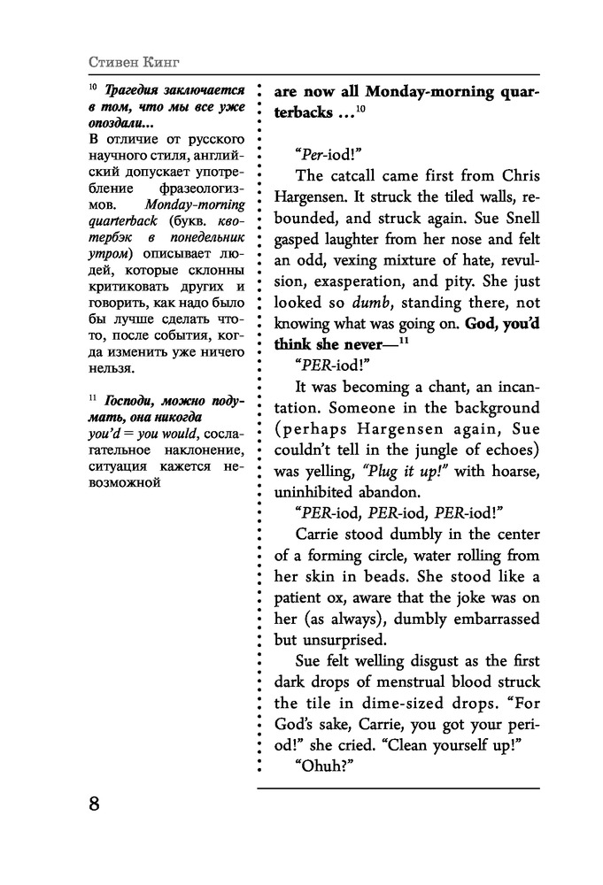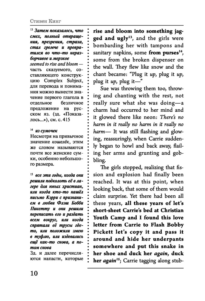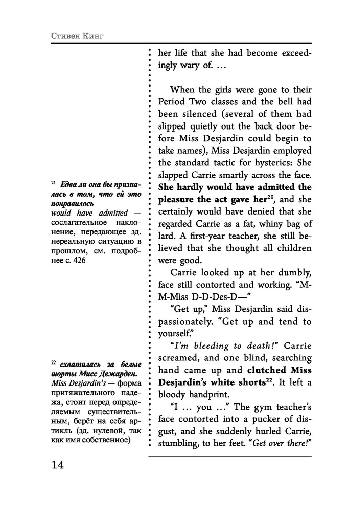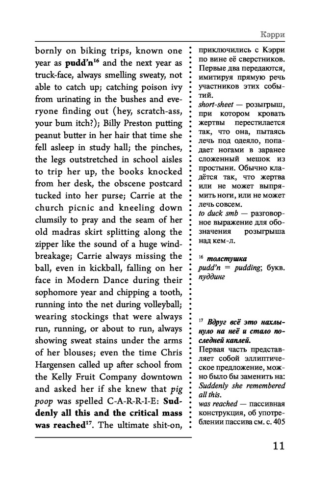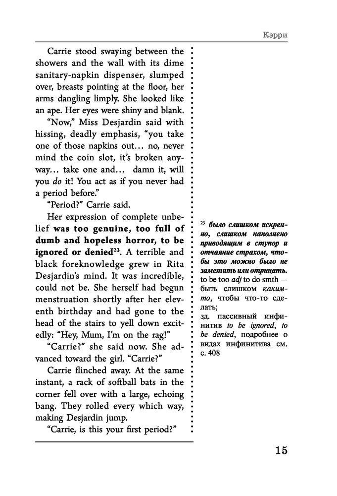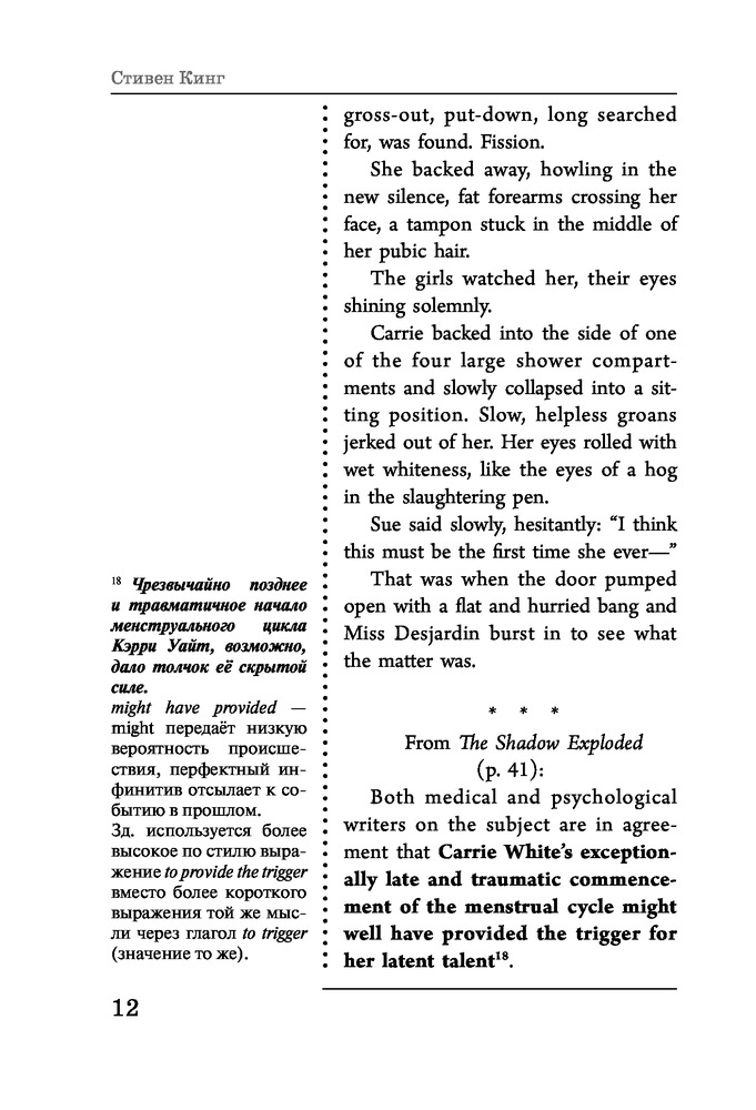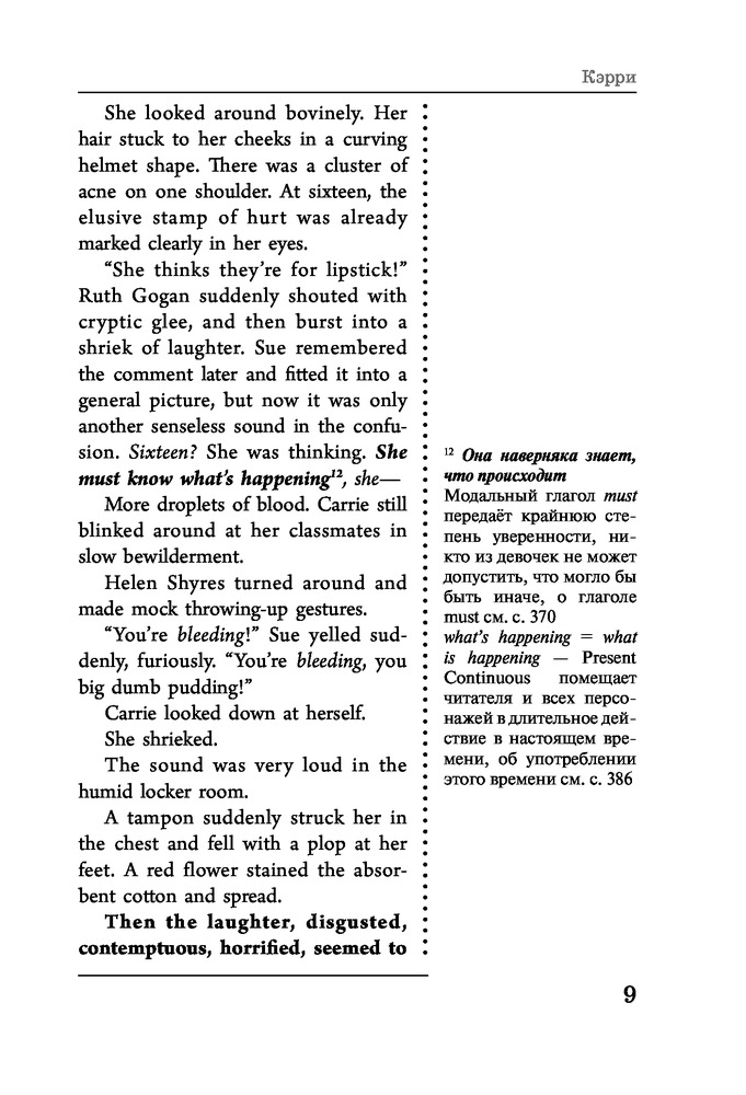 КэрриВ данный момент этот товар отсутствует в продаже. Возможно, у нас найдется аналогичный или похожий товар здесь. Серия: Учим английский, читая классику В серию «Учим английский, читая классику» входят адаптированные и полные произведения мировой классики. Серия известна на рынке и пользуется популярностью. Характерная черта книг этой серии, отличающая ее от других подобных, — наличие лексико-грамматического комментария, расположенного на полях, напротив комментируемого места. В комментариях даются ссылки на соответствующее правило в Грамматическом справочнике, который следует за произведением. «Кэрри» — один из самый известных романов Стивена Кинга. Роман напечатан полностью. В комментариях, помимо грамматики, большое внимание уделено американским реалиям, незнание которых затрудняет понимание. Издание предназначено для всех, кто стремится читать книги в оригинале. |