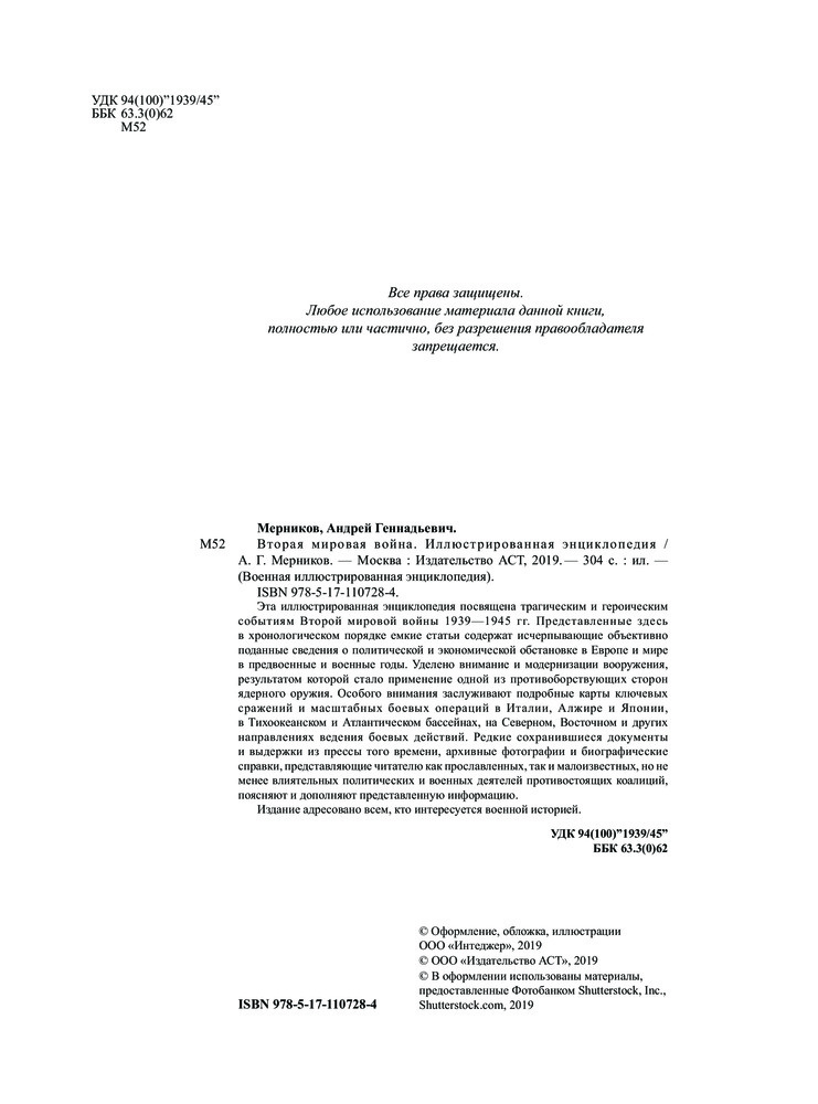 Вторая мировая война. Иллюстрированная энциклопедияВ данный момент этот товар отсутствует в продаже. Возможно, у нас найдется аналогичный или похожий товар здесь. Серия: Военная иллюстрированная энциклопедия Эта иллюстрированная энциклопедия посвящена трагическим и героическим событиям Второй мировой войны 1939–1945 гг. Представленные здесь в хронологическом порядке емкие статьи содержат исчерпывающие объективно поданные сведения о политической и экономической обстановке в Европе и мире в предвоенные и военные годы. Уделено внимание и модернизации вооружения, результатом которой стало применение одной из противоборствующих сторон ядерного оружия. Особого внимания заслуживают подробные карты ключевых сражений и масштабных боевых операций в Италии, Алжире и Японии, в Тихоокеанском и Атлантическом бассейнах, на Северном, Восточном и других направлениях ведения боевых действий. Редкие сохранившиеся документы и выдержки из прессы того времени, архивные фотографии и биографические справки, представляющие читателю как прославленных, так и малоизвестных, но не менее влиятельных политических и военных деятелей противостоящих коалиций, поясняют и дополняют представленную информацию. Издание адресовано всем, кто интересуется военной историей. |