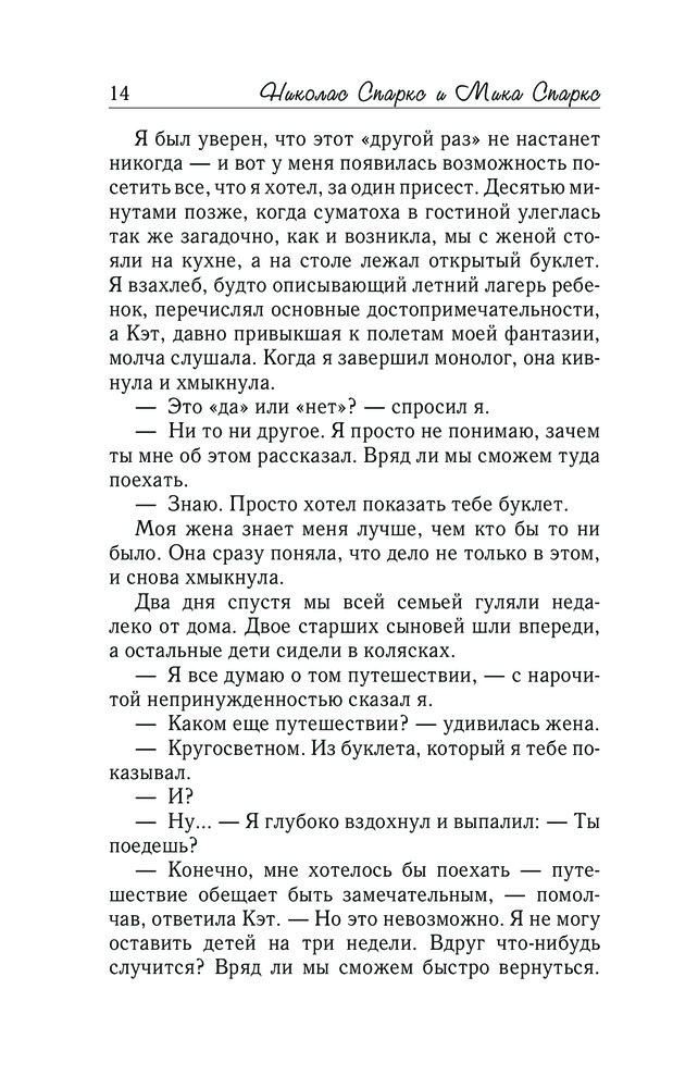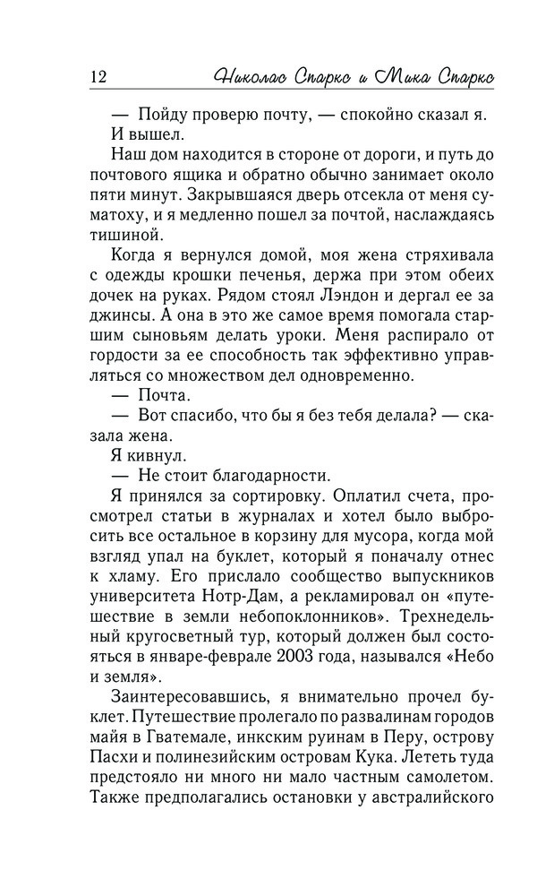 Серия: Спаркс: чудо любви Это особенная книга в творческой биографии Николаса Спаркса. Ее автор множества международных бестселлеров написал вместе со своим старшим братом Микой. После потери обоих родителей братья решили вспомнить детство, провести время вместе и отправились в большое трехнедельное путешествие. И вот перед читателями предстает совсем другой Николас Спаркс, уже не главный романтик современности, а маленький мальчик, во всем равняющийся на старшего брата, любящий муж и заботливый отец. Это рассказ о детстве и юности, первых успехах и потерях, семейных ценностях, совместных открытиях, переживаниях и восторгах. Это история не просто о путешествии по всему миру, это история о братской любви и преданности. История очень личная, трогательная, наполненная юмором и житейской мудростью. |
