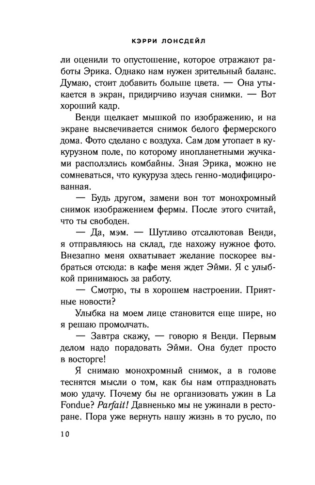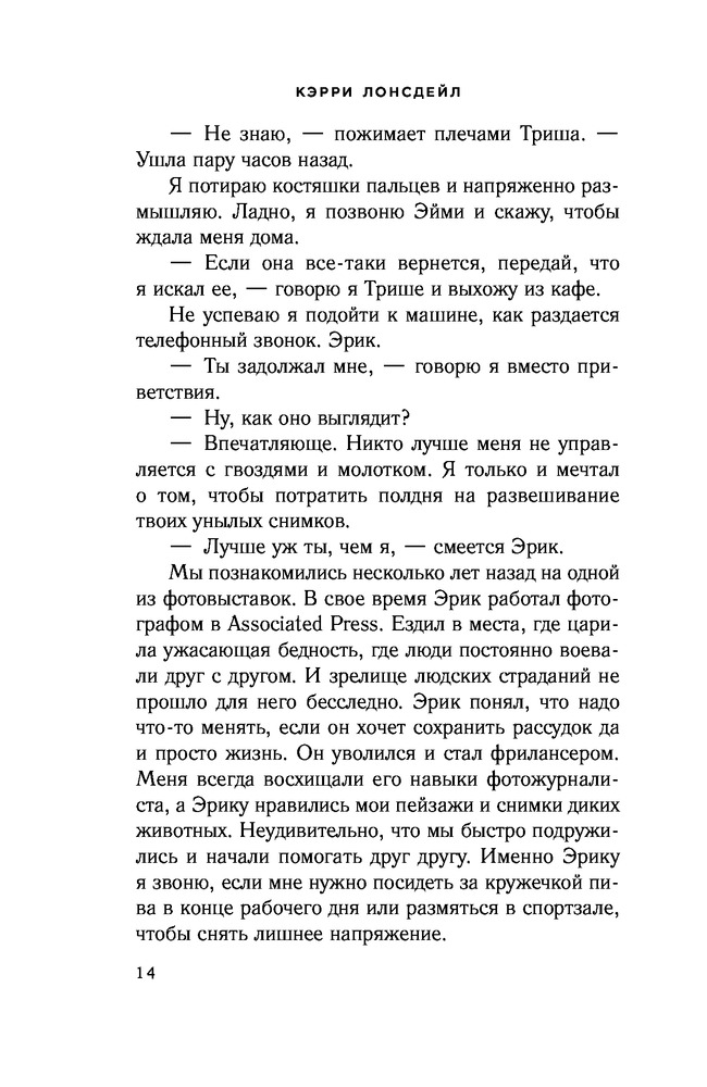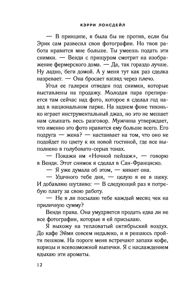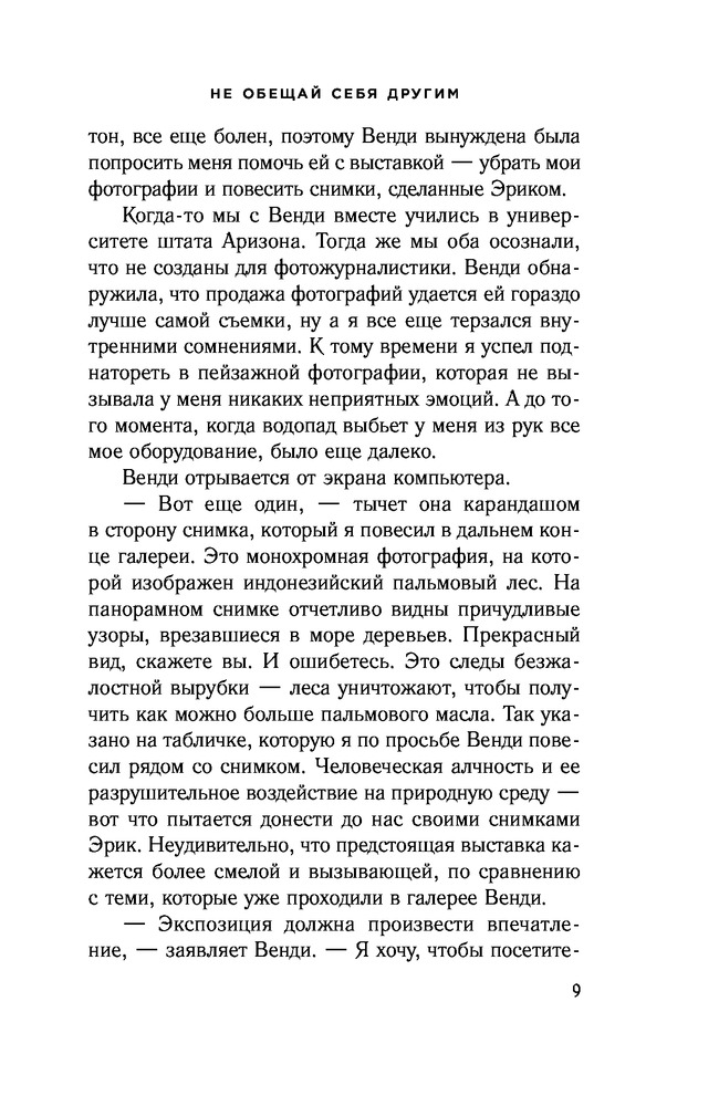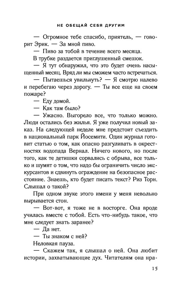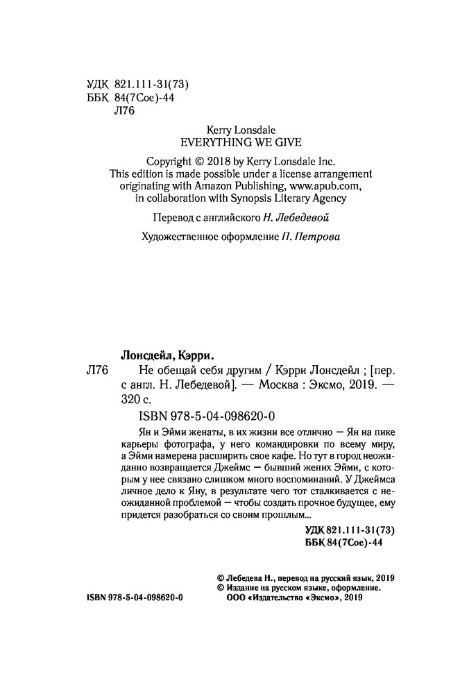💳 Оплатить за товар можно при получении 🇰🇿 Есть бесплатная доставка по Казахстану 🎁 Копите бонусы с каждой покупки Серия: Бестселлер Amazon.com. Романтическая проза Кэрри Лонсдейл и Сары Пэйнтер Роман «Не обещай себя другим» открывает новую страницу в жизни уже многим полюбившихся героев — Эйми, Яна и Джеймса. Те, кто уже знаком с ними, с радостью прочтут новую историю. А тем, кто встретится с ними впервые, мы даже немного завидуем: им только предстоит узнать этих харизматичных персонажей. Ян и Эйми женаты, в их жизни все отлично — Ян на пике карьеры фотографа, у него командировки по всему миру, а Эйми намерена расширить свое кафе. Но тут в город неожиданно возвращается Джеймс — бывший жених Эйми, с которым у нее связано слишком много воспоминаний. У Джеймса личное дело к Яну, в результате чего тот сталкивается с неожиданной проблемой — чтобы создать прочное будущее, ему придется разобраться со своим прошлым... |