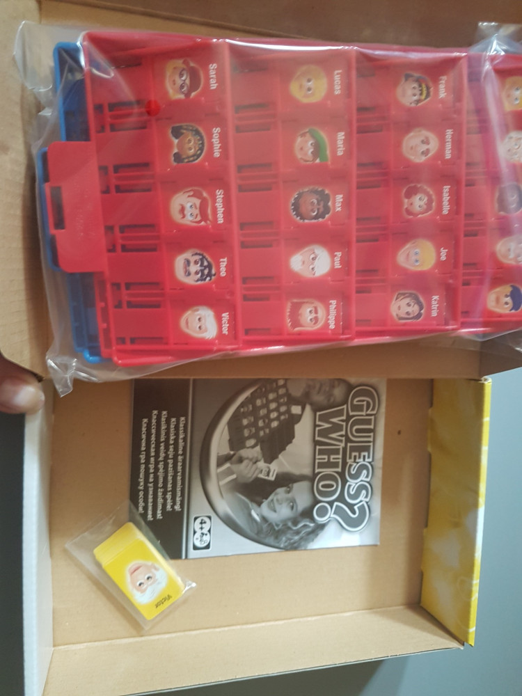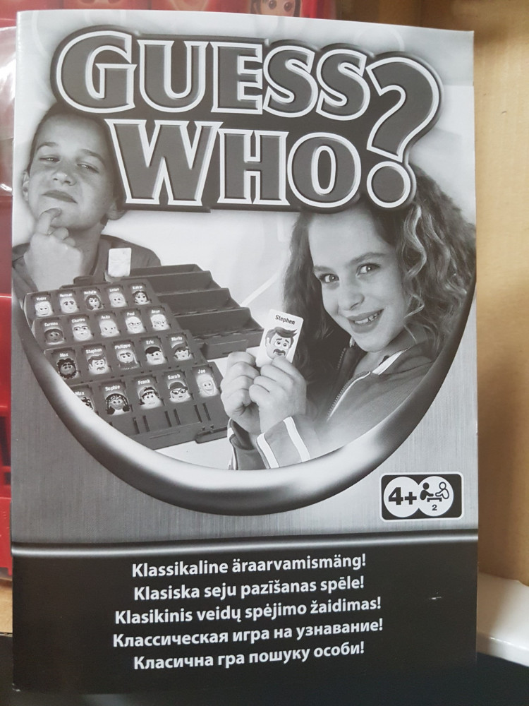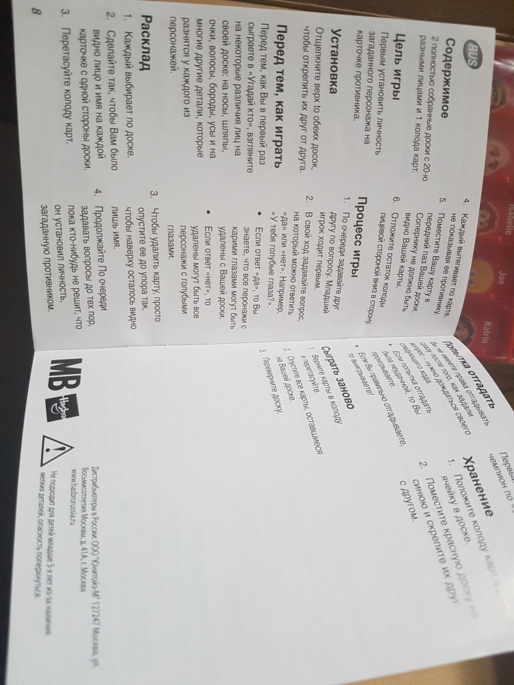 Было указано на сайте, что игра на русском языке. На русском языке лишь правила игры. имена лиц написаны на английском. Это игра не для детей 4+. В описании указано, что в комплекте 2 маркера. У нас было 2 пластиковых поля, карточки с лицами и брошюра с правилами игры на 5 языках, и все. Фото прилагаю.
