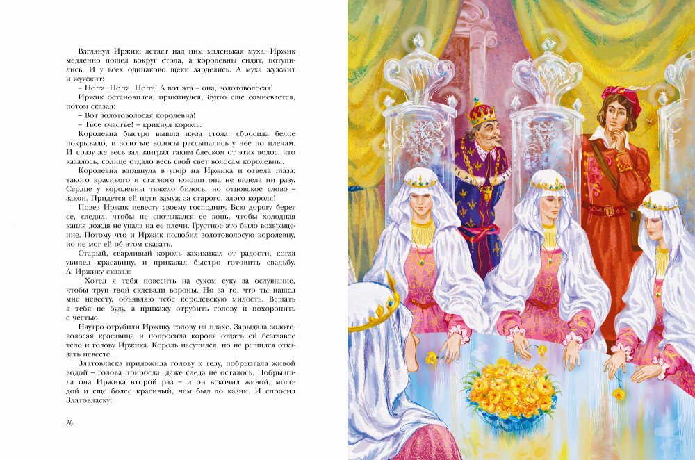 Довольно увесистая книга, формат чуть меньше А4. В сборник вошло 15 сказок: Иван-царевич и серый волк, Златовласка, Волшебное кольцо, Обезьянье царство, Али-Баба и сорок разбойников, Аладдин и волшебная лампа, Джек и бобовый стебель, Джек и золотая табакерка, Тростниковая Шапка, Благодарный тартаро, Пастушка и белый волк, Жан-счастливчик, О чудо-дереве, танцующем ручье и правдивой птице, Медведь и тролли из Довре, О сундуке мудрого старика. Иллюстрации красочные, много, почти на каждой странице есть рисунок большой или маленький. Обложка с лакированным тиснением.