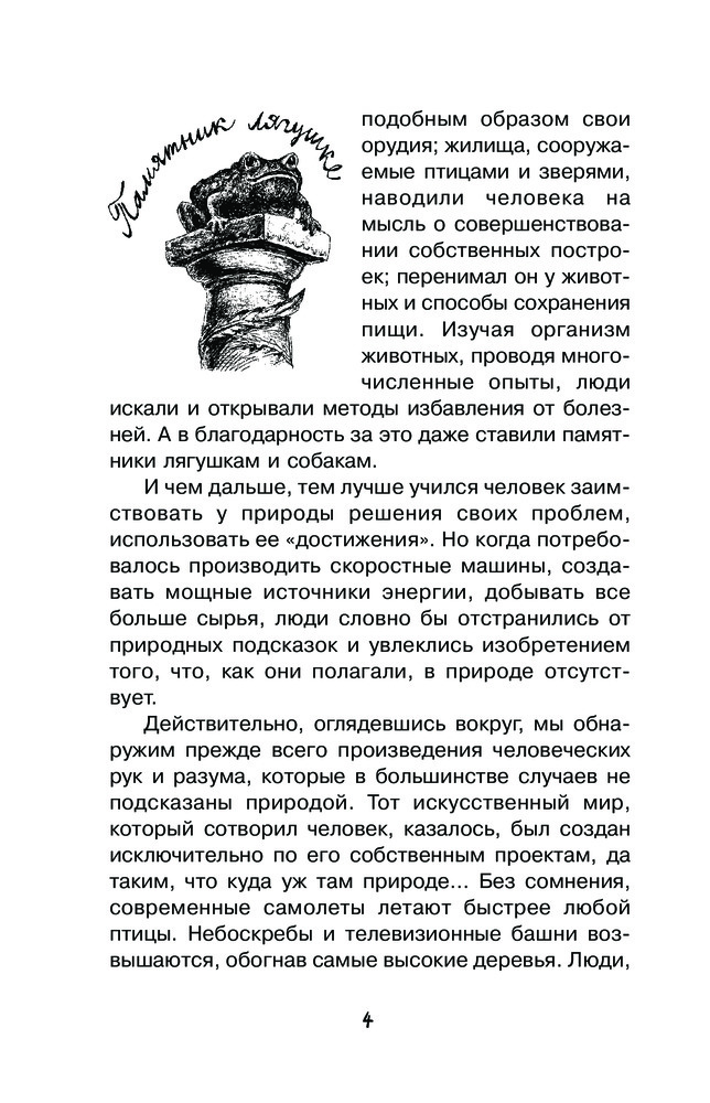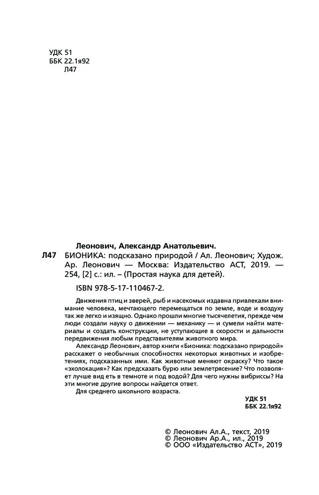 Бионика: подсказано природойЛеонович Александр Анатольевич В данный момент этот товар отсутствует в продаже. Возможно, у нас найдется аналогичный или похожий товар здесь. Серия: Простая наука для детей Движения птиц и зверей, рыб и насекомых издавна привлекали внимание человека, мечтающего перемещаться по земле, воде и воздуху так же легко и изящно. Однако прошли многие тысячелетия, прежде чем люди создали науку о движении — механику — и сумели найти материалы и создать конструкции, не уступающие в скорости и дальности передвижения любым представителям животного мира. Действительно, самолеты поднимаются выше всех птиц, батискафы погружаются глубже практически всех рыб и морских животных, автомобили обгоняют любых зверей. Но ученые и конструкторы постоянно изучают те особенности живой природы, которые позволили бы машинам и механизмам не только бить рекорды, но и двигаться и работать так же плавно и грациозно, бесшумно и безвредно, как это удается, например, дельфинам или стрекозе. |