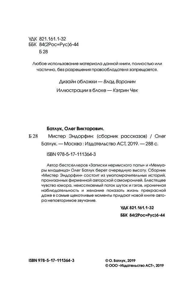 Мистер ЭндорфинВ данный момент этот товар отсутствует в продаже. Возможно, у нас найдется аналогичный или похожий товар здесь. Серия: Легенда русского Интернета Автор бестселлеров «Записки неримского папы» и «Мемуары младенца» Олег Батлук берет очередную высоту. Сборник «Мистер Эндорфин» состоит из умопомрачительных историй, пронизанных фирменной авторской самоиронией. Блестящее чувство юмора, неиссякаемый поток шуток и гэгов, ироничная наблюдательность и желание показать жизнь прекрасной даже в самые щекотливые моменты придают новой книге автора неповторимое звучание. |