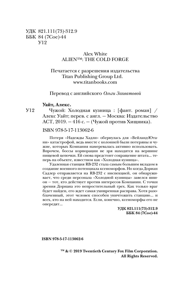 Серия: Чужой против Хищника Потеря «Надежды Хадли» обернулась для «Вейланд-Ютани» катастрофой, ведь вместе с колонией были потеряны и чужие, которых Компания намеревалась активно использовать. Впрочем, боссы корпорации не зря находятся на вершине пищевой цепочки. Ей снова предстоит сокращение штата... теперь на объекте, известном как «Холодная кузница». Удаленная станция RB-232 стала самым большим вкладом в создание военного потенциала ксеноморфов. Но когда Дориан Садлер отправляется на RB-232 с инспекцией, он обнаруживает, что среди персонала «Холодной кузницы» завелся шпион — тот, кто действует против интересов Компании. С точки зрения Дориана это непростительный грех. Как только враг будет найден, его ждет самая ухищренная расправа. Хотя разоблаченный, этот человек способен уничтожить станцию... и всех, кто на ней находится. Если, конечно, ксеноморфы его не опередят... |