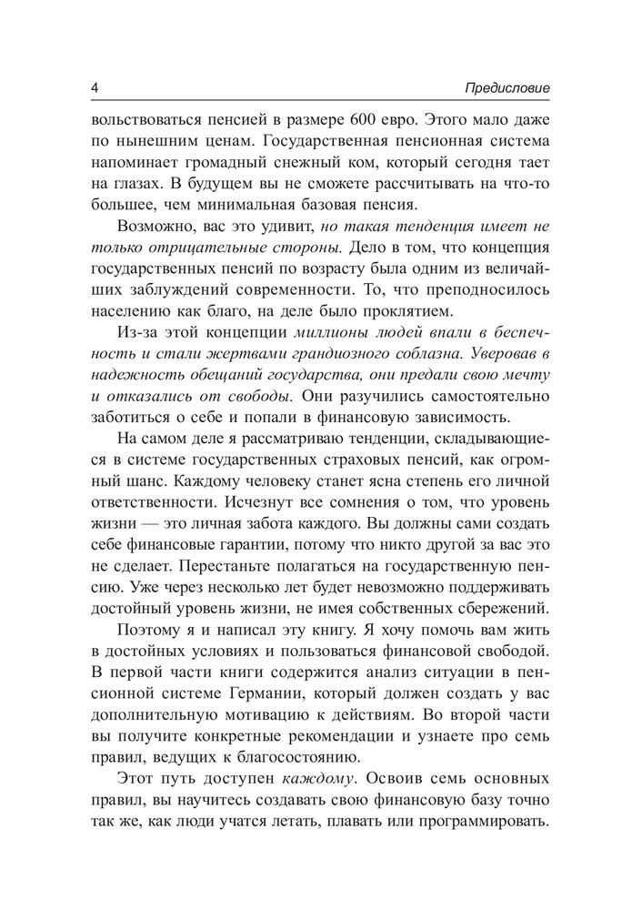 В будущем мы не сможем больше полагаться на пенсию по старости. Государственная пенсионная система напоминает снежный ком, который сегодня тает на глазах. Мы должны сами создать себе финансовые гарантии, не следует смиряться перед лицом грозящей нужды в старости. Бодо Шефер познакомит вас с семью главными правилами, соблюдение которых ведет к финансовой безопасности и свободе. Все действия на пути туда описаны понятным языком и могут быть немедленно реализованы независимо от того, сколько денег у вас сегодня на счете. |