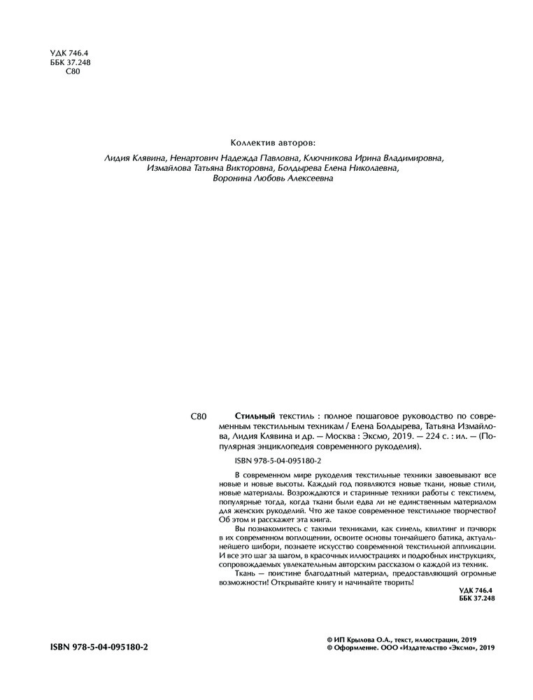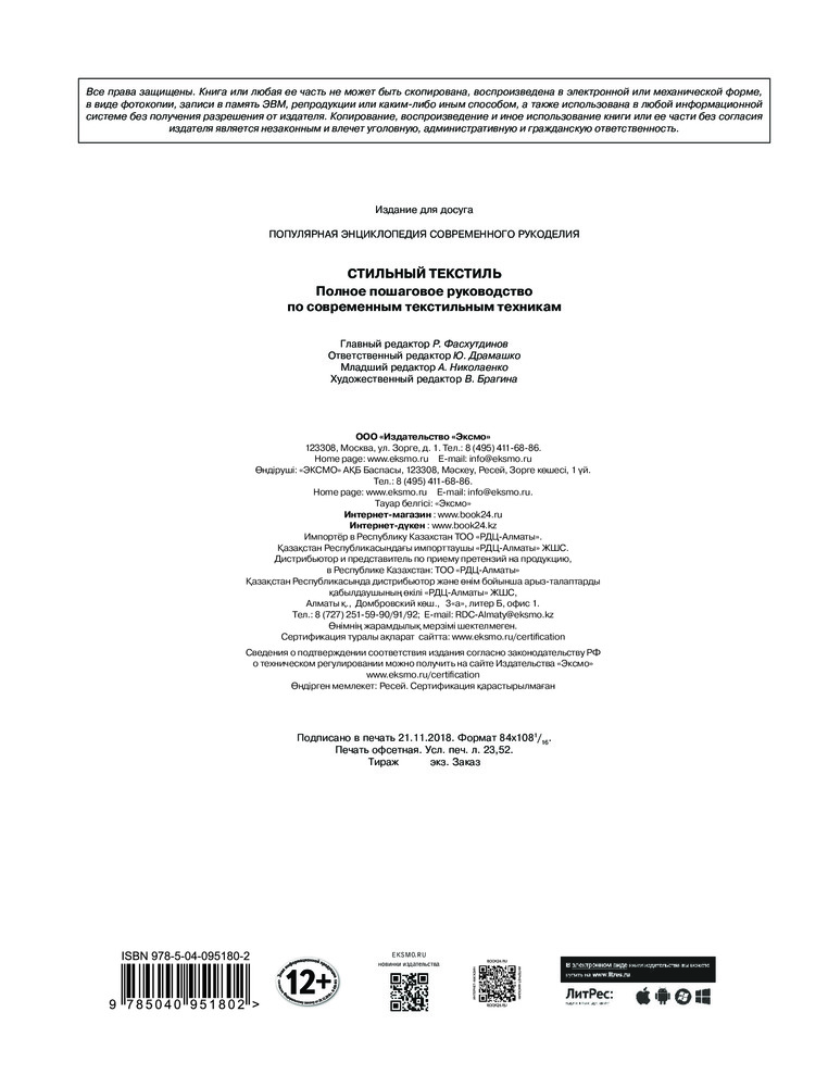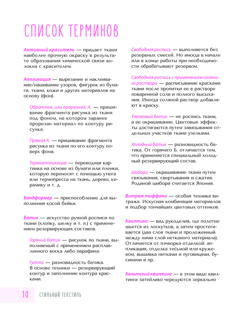 Стильный текстиль. Полное пошаговое руководство по современным текстильным техникамТатьяна Викторовна Измайлова, Елена Николаевна Болдырева, Лидия Клявина В данный момент этот товар отсутствует в продаже. Возможно, у нас найдется аналогичный или похожий товар здесь. Серия: Популярная энциклопедия современного рукоделия Уникальная книга, собравшая в себе все современные тенденции текстильного творчества в пошаговых иллюстрированных мастер-классах! Все самые модные и актуальные техники — шибори, квилтинг, пэчворк, синель, аппликация, батик. Роскошные фотоиллюстрации, мелованная бумага, стильное оформление и уникальный контент. Идеальный подарок творческим натурам! |