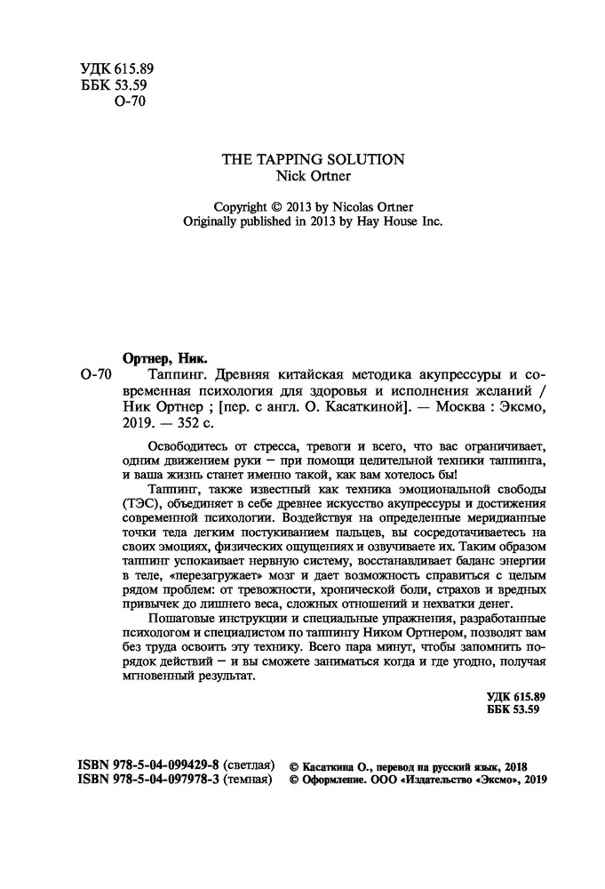 Таппинг. Древняя китайская методика акупрессуры и современная психология для здоровьяВ данный момент этот товар отсутствует в продаже. Возможно, у нас найдется аналогичный или похожий товар здесь. Серия: Исцеляющие прикосновения Освободитесь от стресса, тревоги и всего, что вас ограничивает, одним движением руки — при помощи целительной техники таппинга, и ваша жизнь станет именно такой, как вам хотелось бы! Таппинг, также известный как техника эмоциональной свободы (ТЭС), объединяет в себе древнее искусство акупрессуры и достижения современной психологии. Воздействуя на определенные меридианные точки тела легким постукиванием пальцев, вы сосредотачиваетесь на своих эмоциях, физических ощущениях и озвучиваете их. Таким образом таппинг успокаивает нервную систему, восстанавливает баланс энергии в теле, «перезагружает» мозг и дает возможность справиться с целым рядом проблем: от тревожности, хронической боли, страхов и вредных привычек до лишнего веса, сложных отношений и нехватки денег.  |