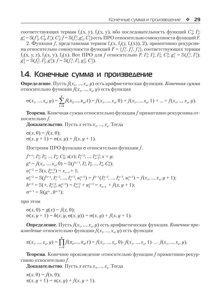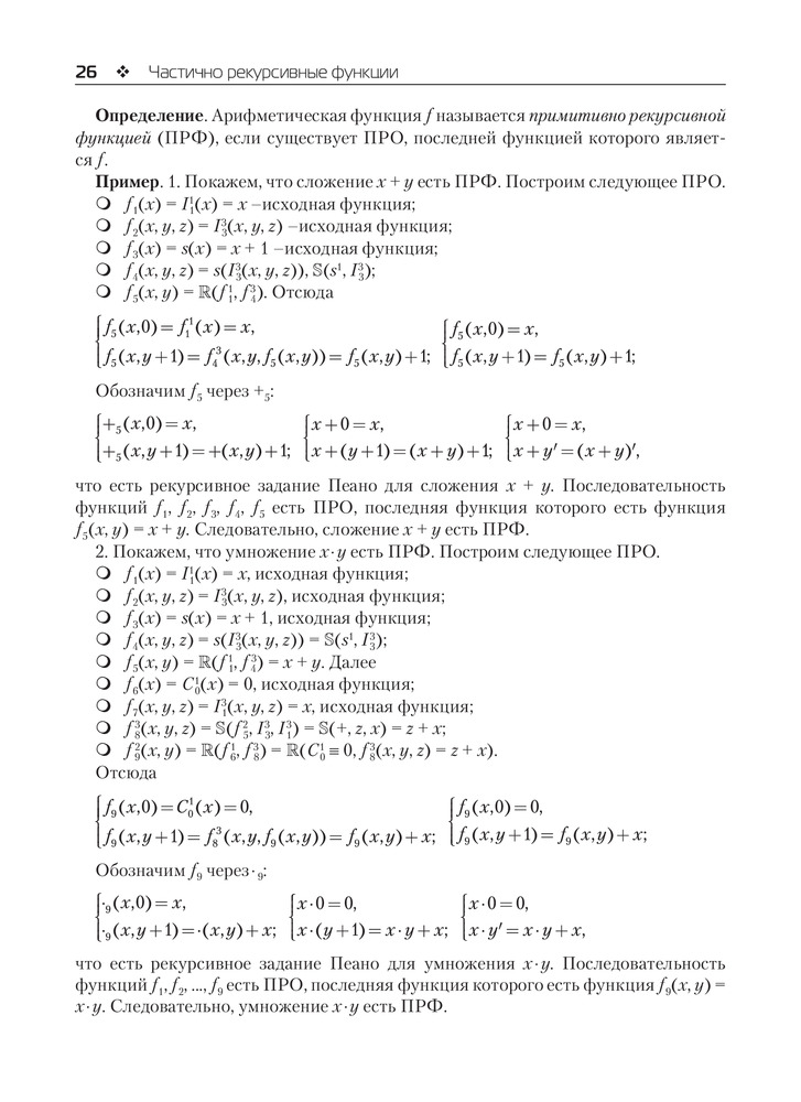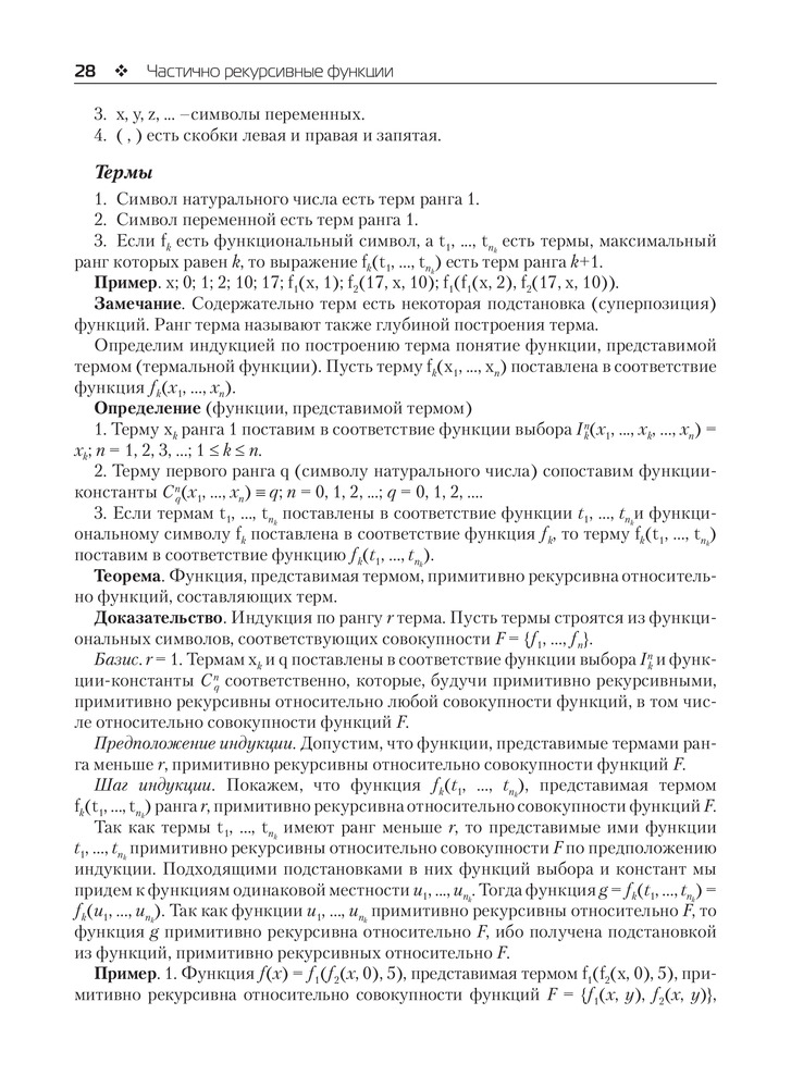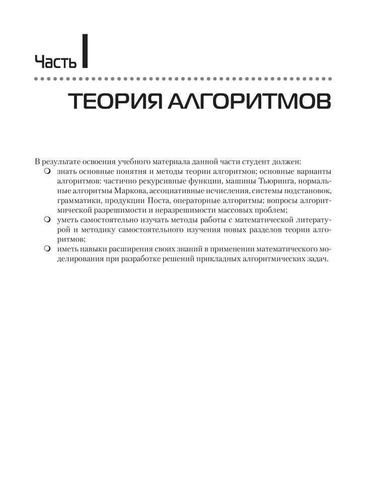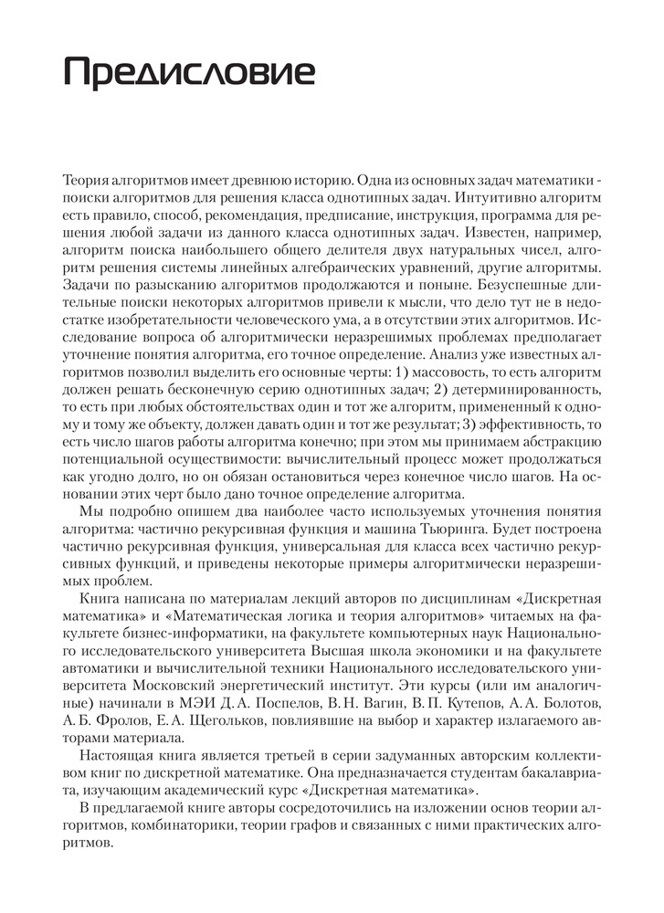 Книга содержит основные сведения из теории алгоритмов: частично-рекурсивные функции, машины Тьюринга, а также элементы комбинаторики, графы и алгоритмы на графах, потоки в транспортных сетях, рекуррентные последовательности, частично упорядоченные множества, решетки, булевы алгебры. Приведены примеры алгоритмически неразрешимых проблем. |