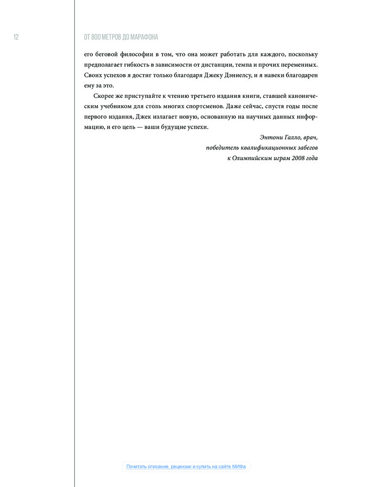 От 800 метров до марафона. Проверенные методы и программы подготовки для успеха в беге на выносливостьВ данный момент этот товар отсутствует в продаже. Возможно, у нас найдется аналогичный или похожий товар здесь. Это обстоятельное руководство освещает множество вопросов: базовые принципы тренировки, физиологию бега, способы измерения спортивной формы и интенсивности тренировок. Те, кто намерен участвовать в соревнованиях, могут составить план тренировок на сезон, распределив нагрузку по неделям и дням и затем отслеживать прогресс по балльной системе Дэниелса. Причем одной теорией дело не ограничивается: подробно описаны виды конкретных тренировок разных уровней интенсивности. |