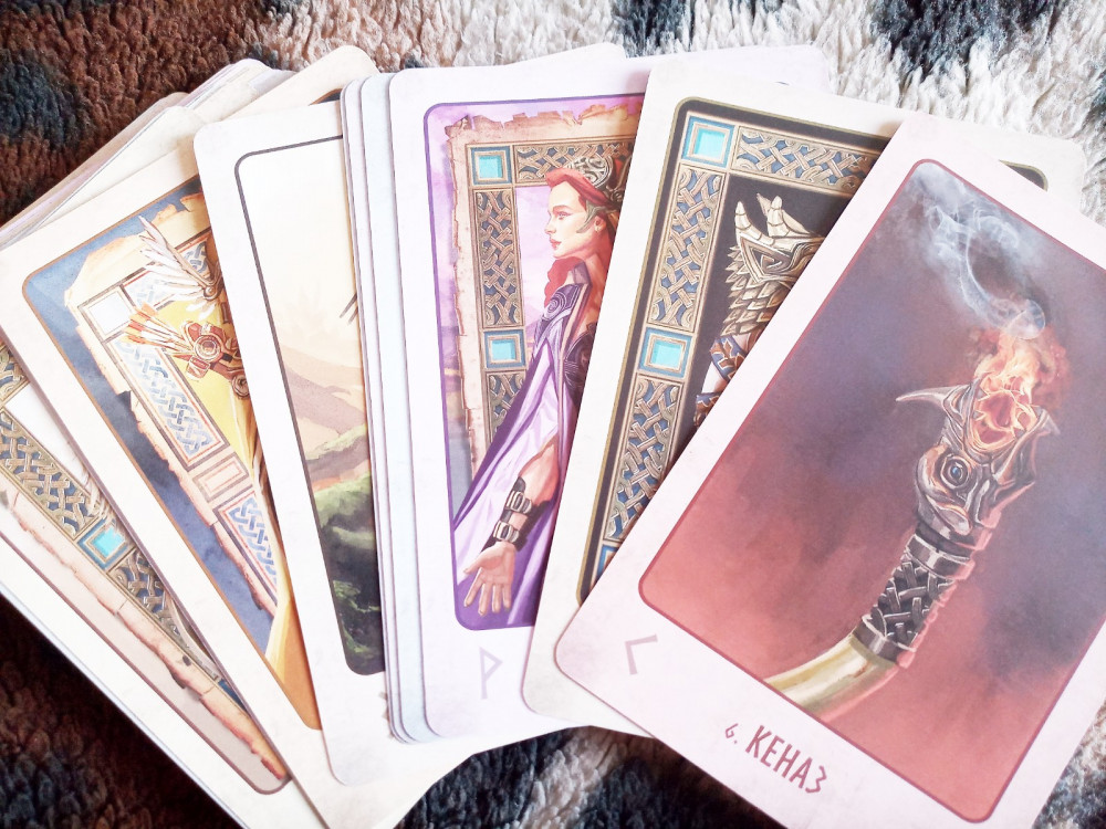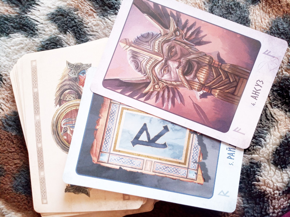 Карты немного крупноваты для тасования, но мне это не мешает, так как можно и просто перемешивать на столе. МБК на белой бумаге, достаточно информативна, особенно для начинающих. Коробка небольшая - по формату карт. Особенно нравится дополнение из карт, посвящённых скандинавским богам. Мне проще работать с рунными ставами, имея изображения для визуализации.