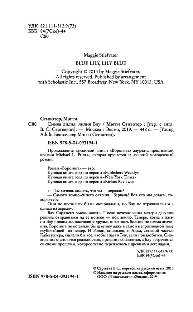 Синяя лилия, лилия БлуВ данный момент этот товар отсутствует в продаже. Возможно, у нас найдется аналогичный или похожий товар здесь. Серия: Young Adult. Бестселлер Мэгги Стивотер. Воронята Продолжение культовой книги «Воронята» лауреата престижной премии Michael L. Printz, которая вручается за лучший молодежный роман. Роман «Воронята» — это: Лучшая книга года по версии «Publishers Weekly» Лучшая книга года по версии «New York Times» Лучшая книга года по версии «Kirkus Reviews» «— Ты хочешь сказать, что ты — зеркало? — Самого темно-синего оттенка. Зеркала! Вот что мы делаем, говорю тебе. Они по-прежнему были материальны, но Блу не отражалась ни в одном из зеркал». Блу Сарджент умела искать. После исчезновения матери девушка решила отправиться на ее поиски — под землю. Теперь, когда в жизни Блу появились настоящие друзья, опасность больше не имела значения. Воронята не оставили бы девушку даже в самой непроглядной тьме глубочайшей из пещер. И Ронан, сновидец, и Адам, ставший частью Кабесуотера, сделали бы все, чтобы спасти Блу, если понадобится. Сновидения становятся реальностью, предания сбываются, а Блу встречается со своим прошлым, которое тесно переплелось с древними легендами.  |