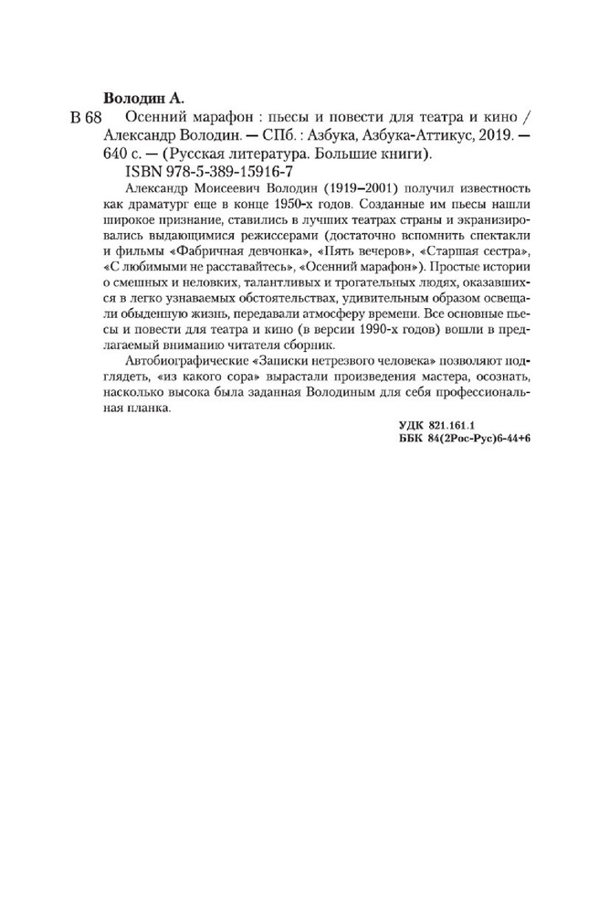 Осенний марафонВ данный момент этот товар отсутствует в продаже. Возможно, у нас найдется аналогичный или похожий товар здесь. Серия: Русская литература. Большие книги Александр Моисеевич Володин (1919–2001) получил известность как драматург еще в конце 1950-х годов. Созданные им пьесы нашли широкое признание, шли в лучших театрах страны и экранизировались выдающимися режиссерами (достаточно вспомнить спектакли и фильмы «Фабричная девчонка», «Пять вечеров», «Старшая сестра», «С любимыми не расставайтесь», «Осенний марафон»...). Простые истории о смешных и неловких, талантливых и трогательных людях, оказавшихся в легко узнаваемых обстоятельствах, удивительным образом освещали обыденную жизнь, передавали атмосферу времени. Все основные пьесы и повести для театра и кино (в версии 1990-х годов) вошли в предлагаемый вниманию читателя сборник. Автобиографические «Записки нетрезвого человека» позволяют подглядеть, «из какого сора» вырастали произведения мастера, осознать, насколько высока была заданная Володиным для себя профессиональная планка. |