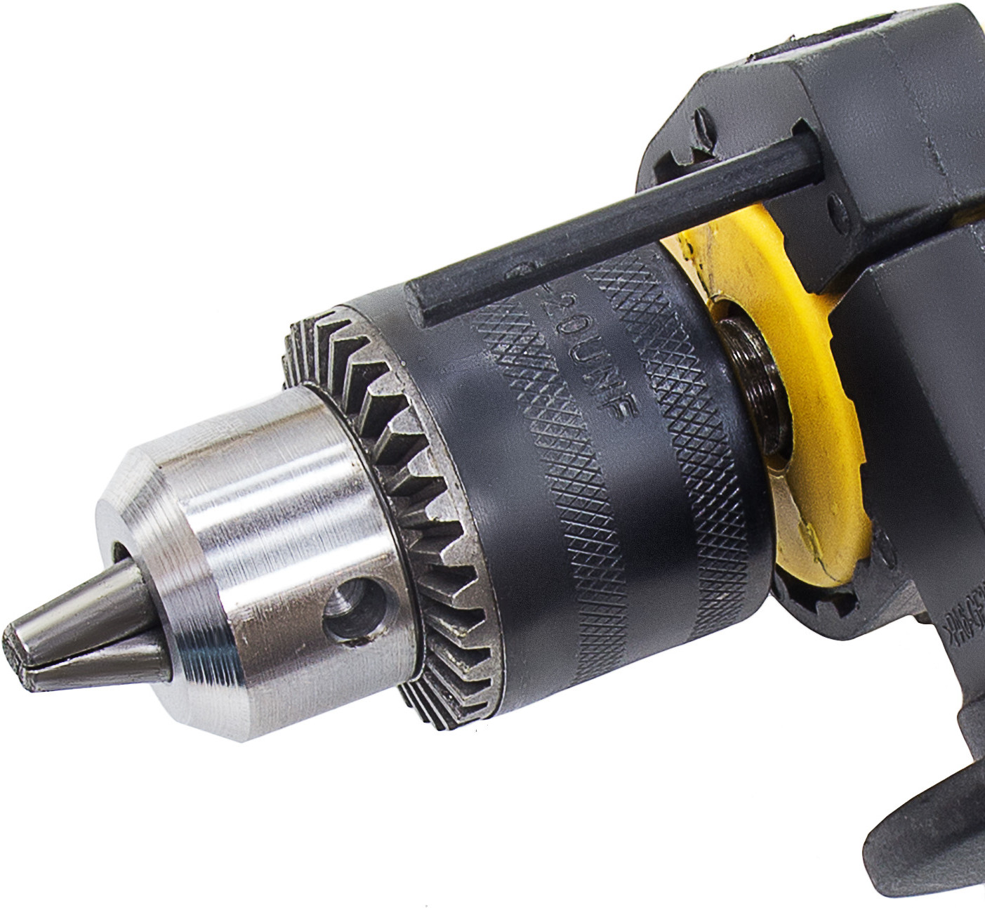 Ключевой металлический патрон обеспечивает надежную фиксацию насадки. Фиксатор кнопки выключателя значительно уменьшает утомляемость пользователя при продолжительной работе. Функция реверса служит для легкого выкручивания сверла из материала и выворачивания крепежа. Глубиномер позволяет осуществить сверление отверстий на заданную глубину. Эргономичный корпус, дополнительная рукоятка, а также небольшой вес ударной дрели KOLNER KID 700V обеспечивает удобный хват и комфорт пользователя даже при длительном сверлении. Дрель KID 700V комплектуется ключом патрона и запасным комплектом угольных щеток.