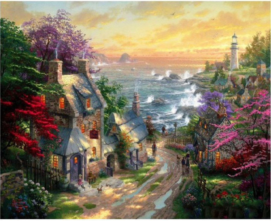 С помощью набора для рисования по номерам можно нарисовать деревню на берегу моря. Море неспокойно, на улочке местами виднеются лужи, прогуливаются люди. В домах, окруженных цветущими деревьями и кустарниками, уютно горит свет. Вдалеке виднеется маяк.