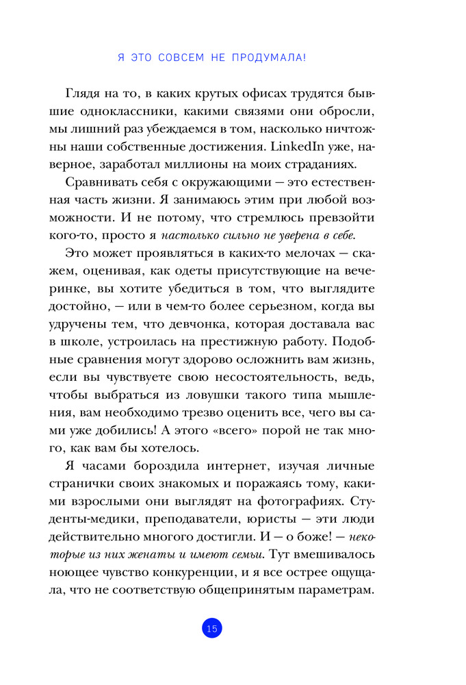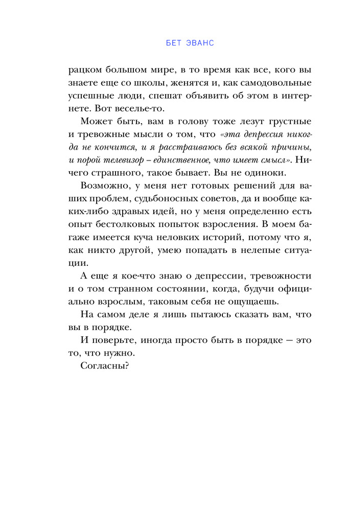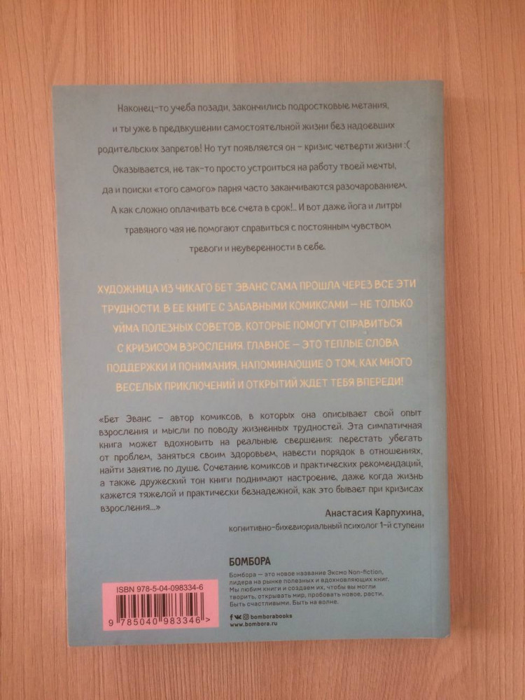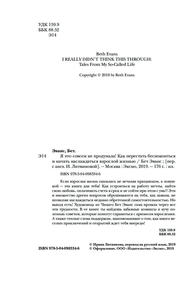 Я это совсем не продумала! Как перестать беспокоиться и начать наслаждаться взрослой жизньюВ данный момент этот товар отсутствует в продаже. Возможно, у нас найдется аналогичный или похожий товар здесь. Серия: Это взрослая жизнь, детка! Книги для тех, у кого все впереди Если взрослая жизнь оказалась не вечным праздником, а ловушкой — это книга для тебя! Как устроиться на работу мечты, найти свою любовь, оплачивать счета в срок и не сойти при этом с ума?! Эти и множество других вопросов обрушиваются на тебя, как лавина, не позволяя наслаждаться недавно обретенной самостоятельностью. Но выход есть! Художница из Чикаго Бет Эванс сама прошла через все эти трудности. В ее книге ты найдешь забавные комиксы и кучу полезных советов, которые помогут справиться с кризисом взросления. А также теплые слова поддержки, напоминающие о том, как много веселых приключений и открытий ждет тебя впереди! |
