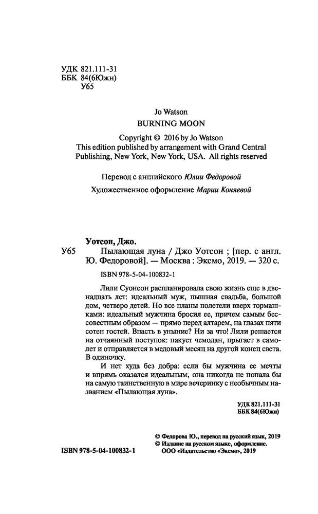 Пылающая лунаВ данный момент этот товар отсутствует в продаже. Возможно, у нас найдется аналогичный или похожий товар здесь. Серия: Хит Wattpad. Люби, путешествуй, радуйся Лили Суонсон распланировала свою жизнь еще в двенадцать лет: идеальный муж, пышная свадьба, большой дом, четверо детей. Но все планы полетели вверх тормашками: идеальный мужчина бросил ее, причем самым бессовестным образом — прямо перед алтарем, на глазах пяти сотен гостей. Впасть в уныние? Ни за что! Лили решается на отчаянный поступок: пакует чемодан, прыгает в самолет и отправляется в медовый месяц на другой конец света. В одиночку. И нет худа без добра: если бы мужчина ее мечты и впрямь оказался идеальным, она никогда не попала бы на самую таинственную в мире вечеринку с необычным названием «Пылающая луна». |