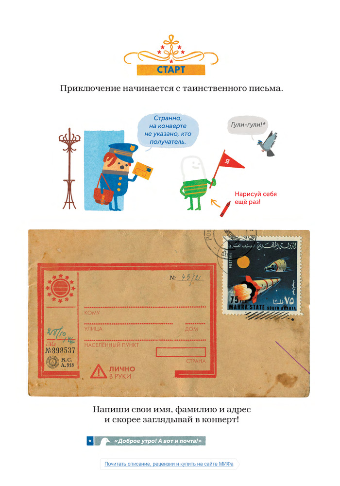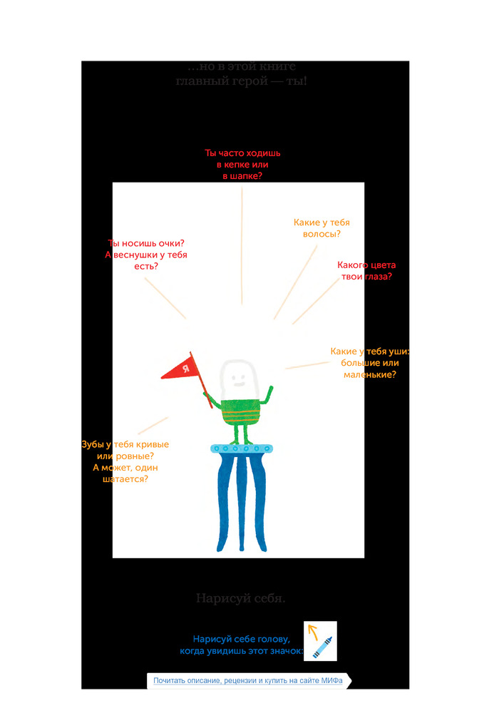 • эта книга — интерактивная, а это значит, что все, что нужно делать, ребенок узнает из самой книги. Задания нужно выполнять последовательно: рисовать, дорисовывать, раскрашивать, вырезать детали из прилагающегося постера и приклеивать на страницы в отмеченных местах. При этом большинство задач вариативные — ребенок сам делает выбор или решает, как именно их выполнять;