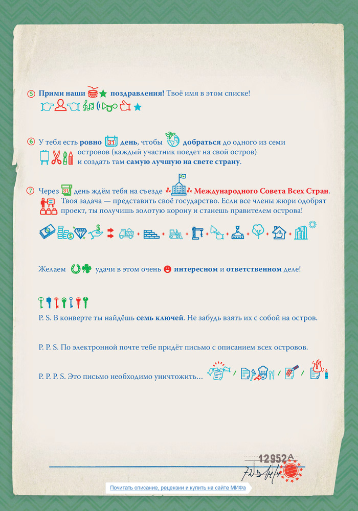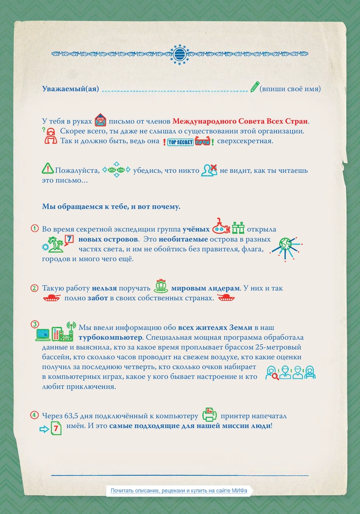 • сюжет книги начинается с того, что юный читатель получает секретное письмо и отправляется на один из семи необитаемых островов. На какой именно и как он будет до него добираться — решает сам. По прибытии он выбирает название для своего государства, флаг и праздники. Затем населяет страну жителями, строит им дома, заводит домашних животных и огороды с новыми сортами овощей и фруктов, которым сам придумывает названия. Потом прокладывает дороги, придумывает новые знаки дорожного движения, выписывает штрафы, вызывает скорую, пожарных и полицию. После этого строит фабрику, населяет зоопарк зверями и птицами, создает клубы по интересам, описывает погоду на острове, строит гостиницу для туристов, создает новые блюда местной кухни и музей имени себя, а также выбирает сувениры: