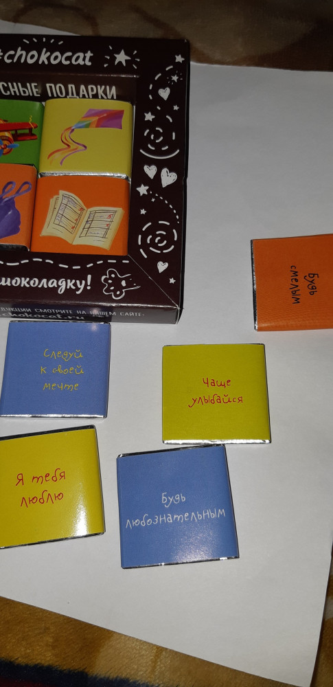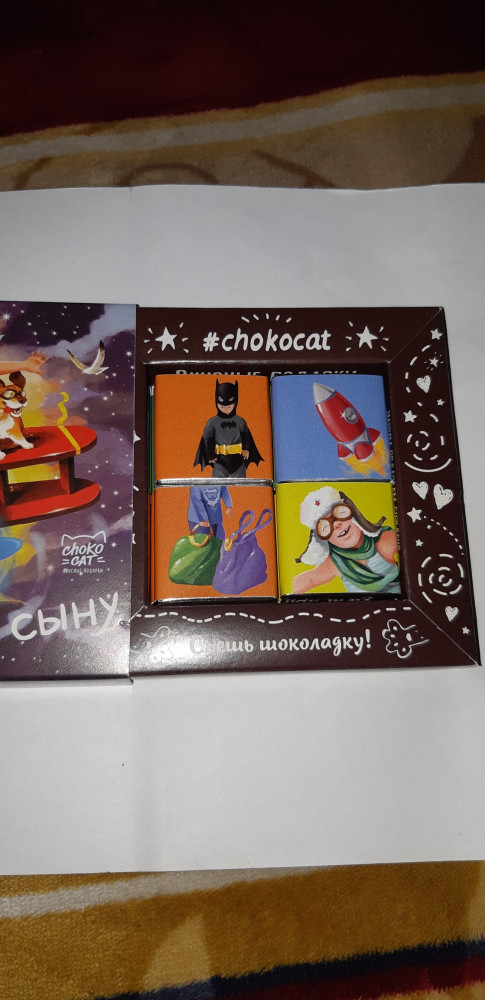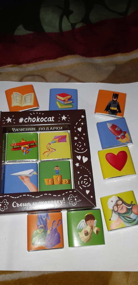 Шоколад вкусный, упаковка красивая и оригинальная. Сыну понравилось. На каждой шоколадочке картинка, а с обратной стороны пожелания. Размер конечно маленький, но на подарок необычно. Я вообще люблю дарить всем что то необычное и на flip всегда можно найти что то эдакое для подарка. Спасибо Вам за это.