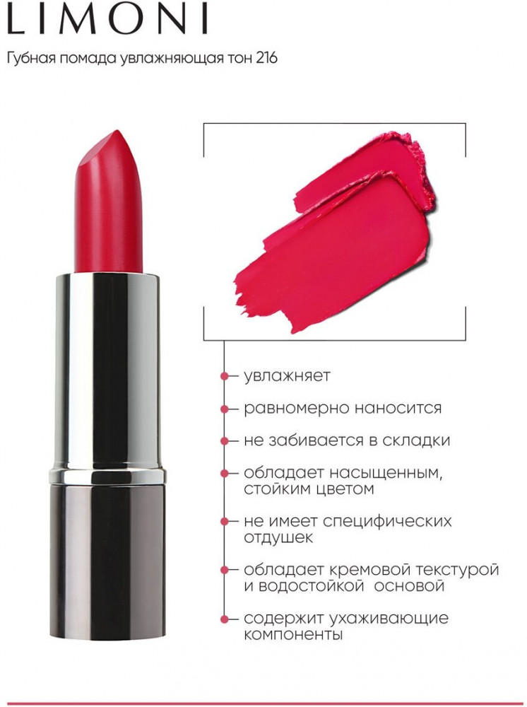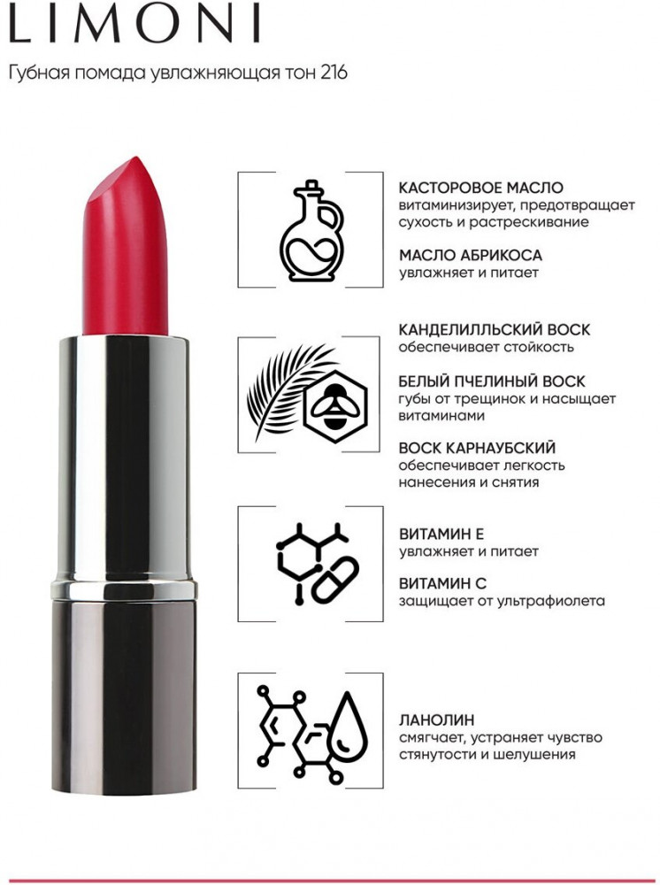Благодаря этим ингредиентам губы прекрасно увлажняются и защищены от окружающей среды и ее неблагоприятного воздействия. Губная помада увлажняющая имеет широкую цветовую палитру, включающую в себя различные оттенки (от холодного до теплого). Выгодно подчеркнуть помаду можно с помощью карандаша для губ Limoni.