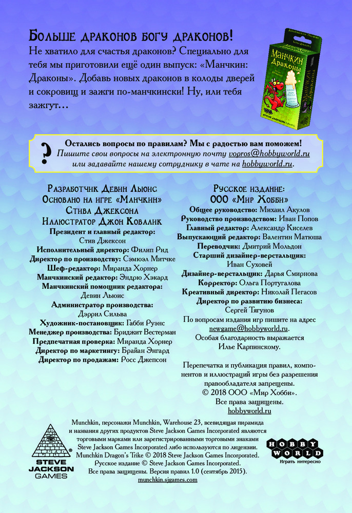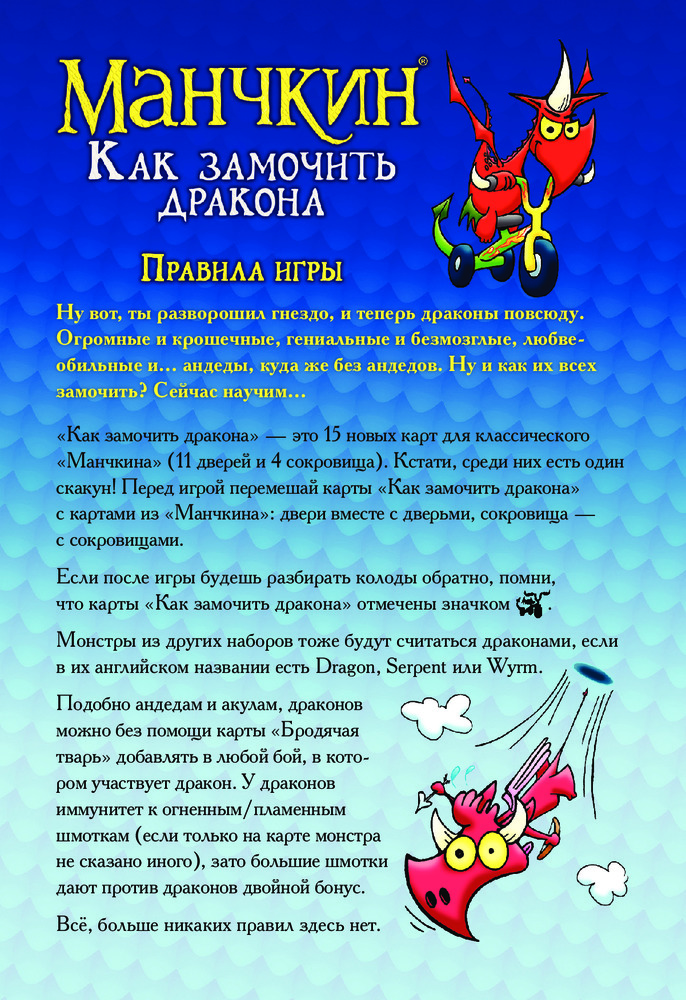 Hobby World Игра настольная «Как замочить дракона» (дополнение)В данный момент этот товар отсутствует в продаже. Возможно, у нас найдется аналогичный или похожий товар здесь. Серия: Манчкин Драконов много не бывает — решили драконы и пригнали себе в помощь всю родню: драконесс в элегантных платьях, необстрелянных птенцов, близняшек-драконяшек и даже дальних славянских родичей-горынычей. Если тебе всё ещё милы запретные сокровища, придётся замочить всю эту хвостатую братию. Как? Ты ж манчкин. Копьё в зубы, «скорпион» на плечи — и вперёд! |