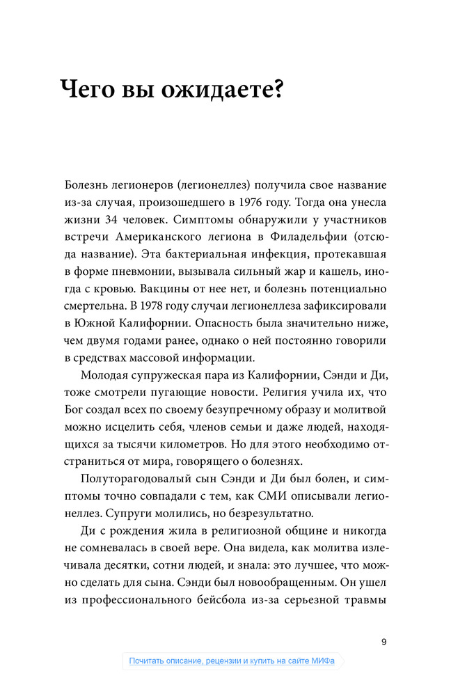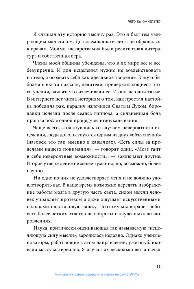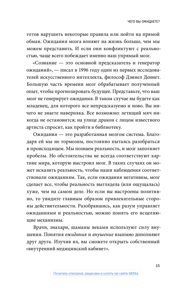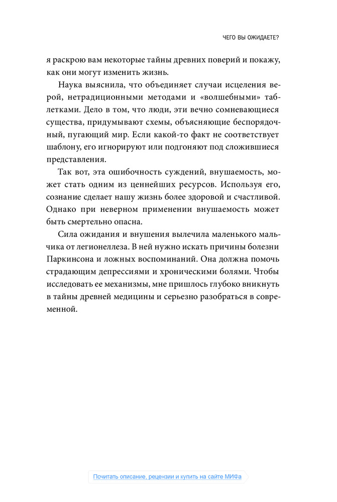 💳 Оплатить за товар можно при получении 🇰🇿 Есть бесплатная доставка по Казахстану 🎁 Копите бонусы с каждой покупки Серия: Личное развитие Ожидания, вера и самообман могут серьезно влиять на наше тело и разум. Эрик Ванс исследует тему «внутренней фармацевтики» настоящих химических реакций, производимых нашим мозгом, когда мы думаем, что испытываем боль или лечимся (даже если это не происходит на самом деле). Благодаря современным технологиям сканирования мозга и детальному исследованию истории плацебо и нетрадиционной медицины Эрик Ванс показывает, как наша внушаемость может стать возможностью для персонализированной медицины. |