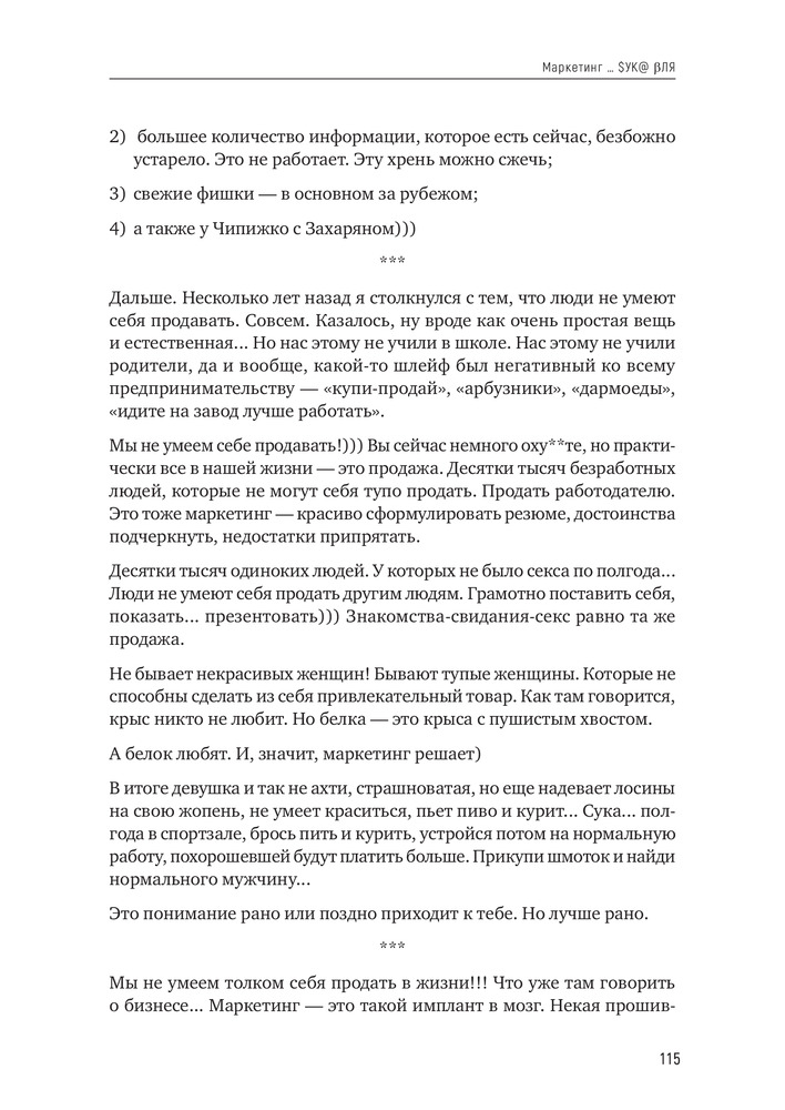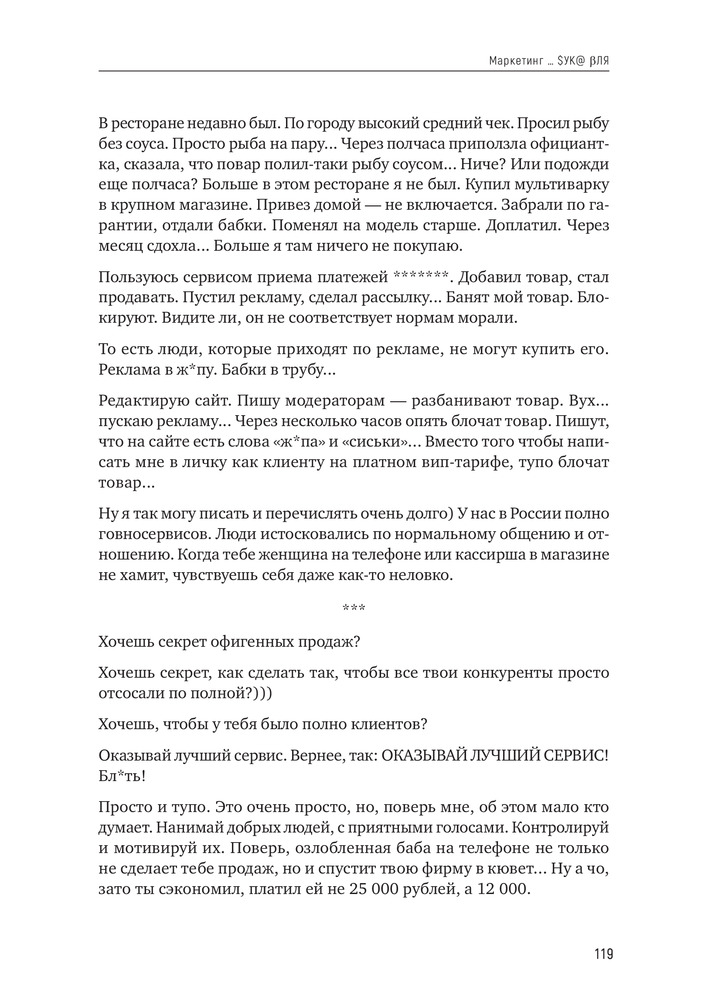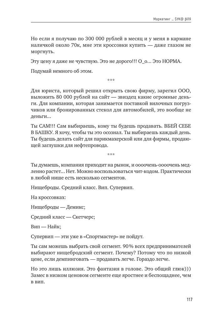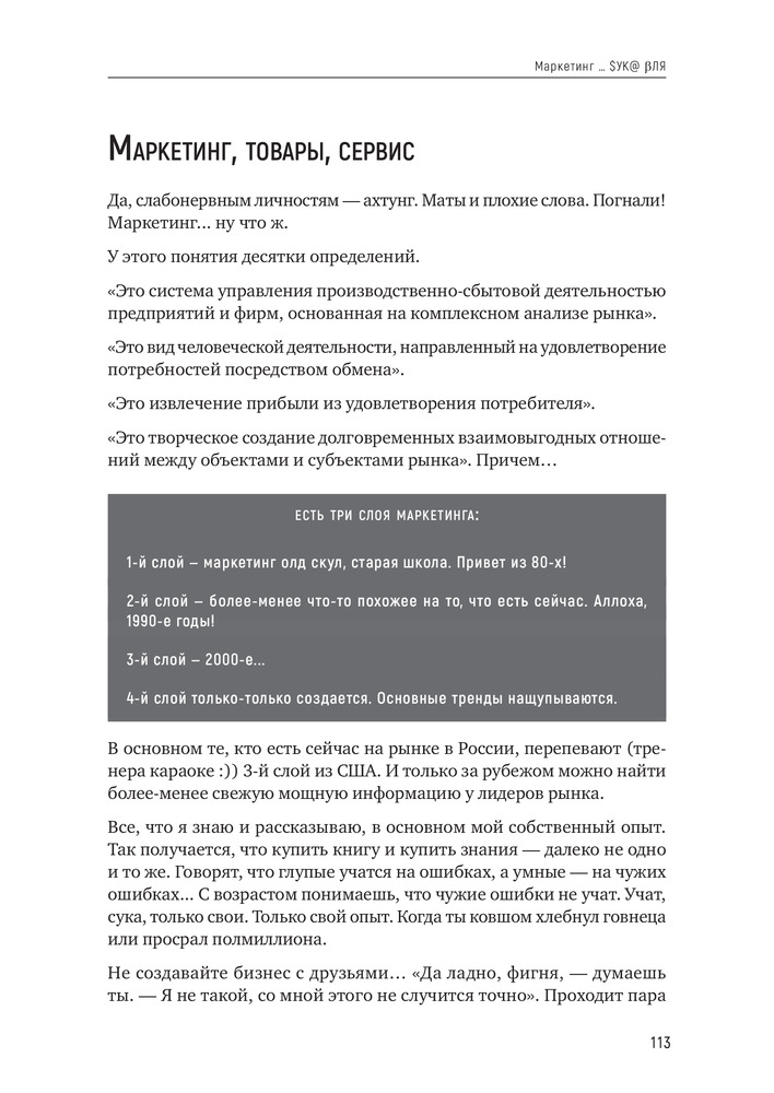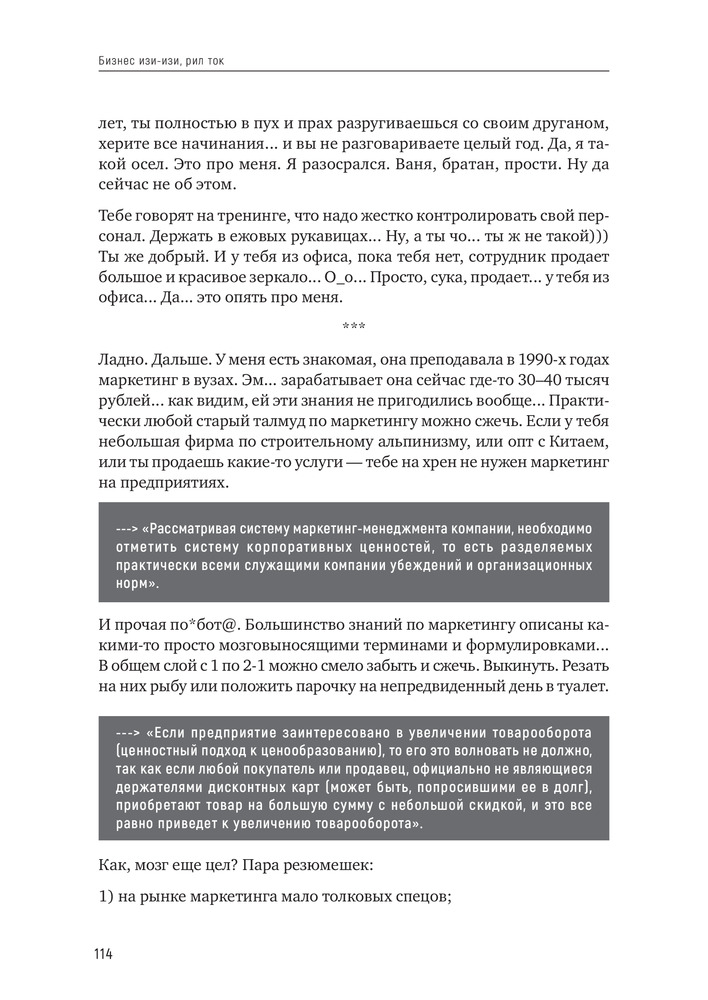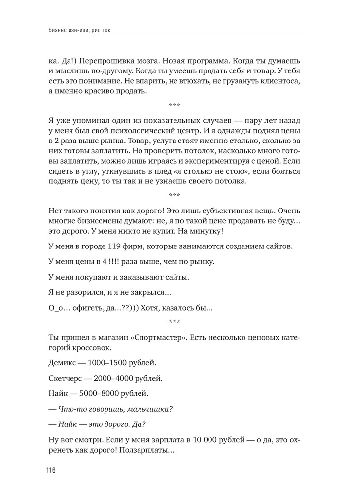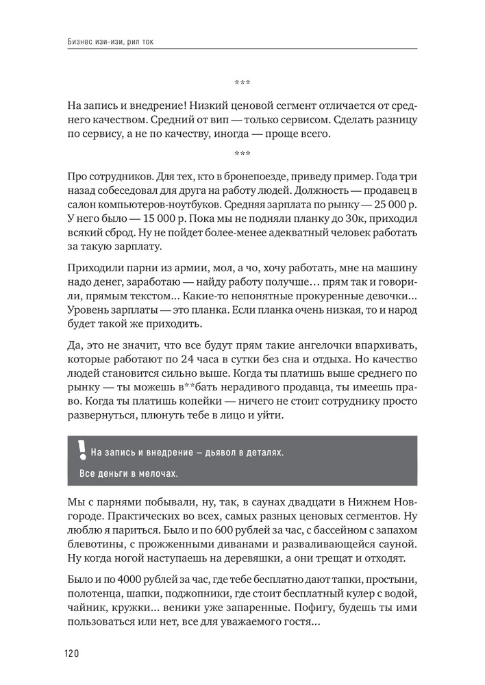 Книга о ведении бизнеса для новичков и тех кто заблудился, в процессе чтения складывалось ощущение, что со мной разговаривает старший брат и все истины ведения бизнеса раскладывает по полочкам, без мишуры и нудных нравоучений. Отдельно хочется упомянуть информацию по маркетингу, те фишки которые дает Александр в этой книге стоят в разы дороже по мне, чем так, которую мы заплатили за книгу) и я считаю эту книгу кладезью для любого новичка, который только шагнул в мир бизнеса и делает первые шаги, а также всем тем у кого уже есть опыт, но он хочется получить глоток свежего воздуха. 5 из 5