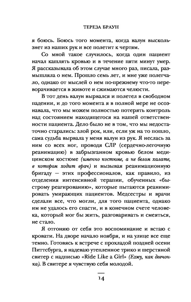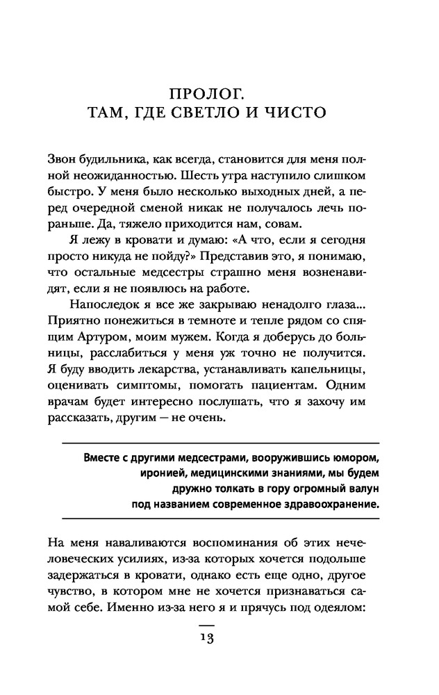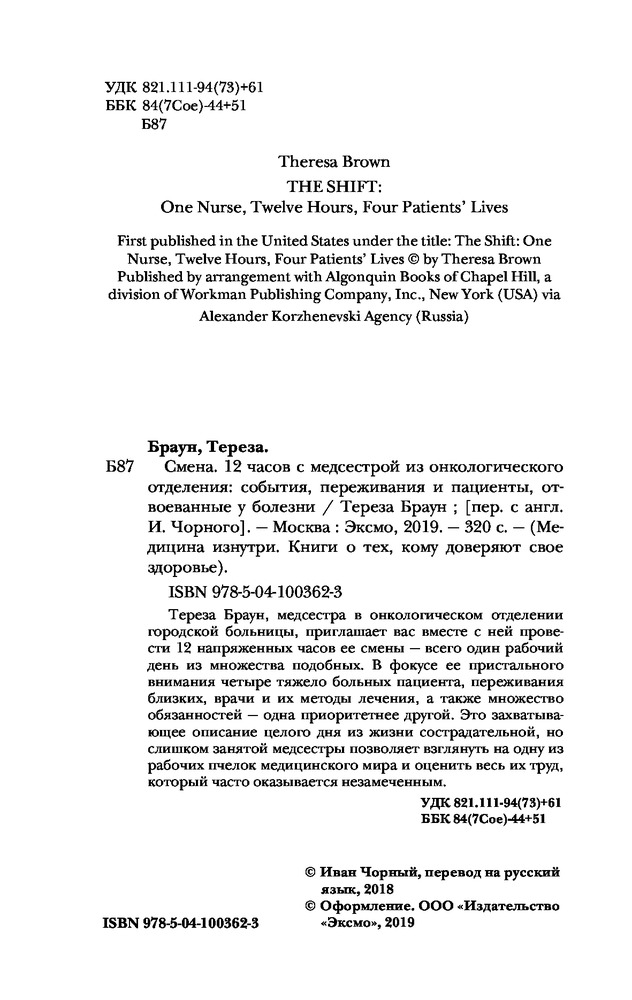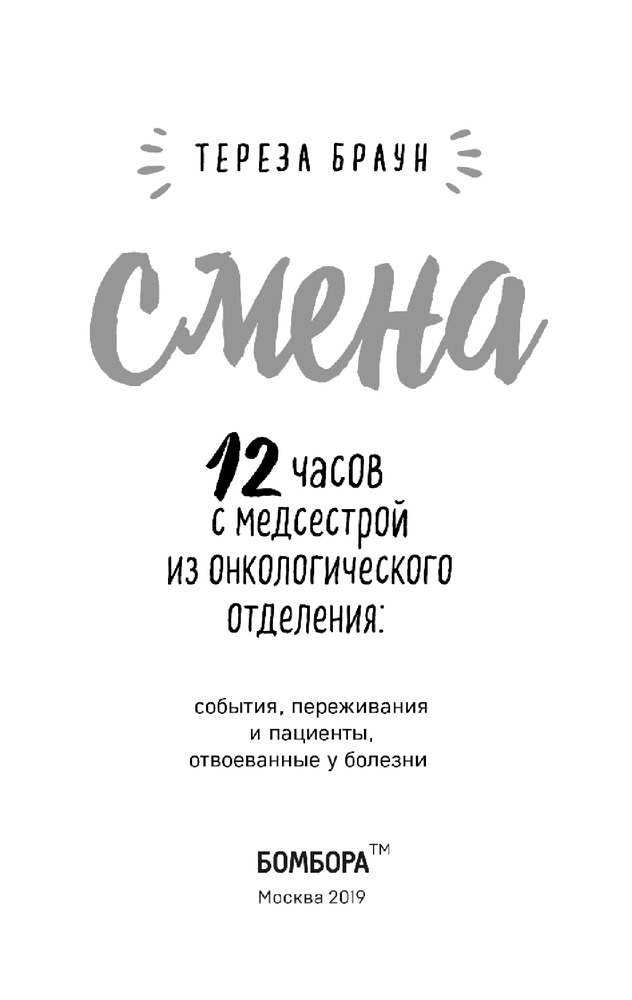 Смена. 12 часов с медсестрой из онкологического отделения: события, переживания и пациенты, отвоеванные у болезниВ данный момент этот товар отсутствует в продаже. Возможно, у нас найдется аналогичный или похожий товар здесь. Серия: Медицина изнутри. Книги о тех, кому доверяют свое здоровье Тереза Браун, медсестра в онкологическом отделении городской больницы, приглашает вас вместе с ней провести 12 напряженных часов ее смены — всего один рабочий день из множества подобных. В фокусе ее пристального внимания четыре тяжело больных пациента, переживания близких, врачи и их методы лечения, а также множество обязанностей — одно приоритетнее другого. Это захватывающее описание целого дня из жизни сострадательной, но слишком занятой медсестры позволяет взглянуть на одну из рабочих пчелок медицинского мира и оценить весь их труд, который часто оказывается незамеченным.  |