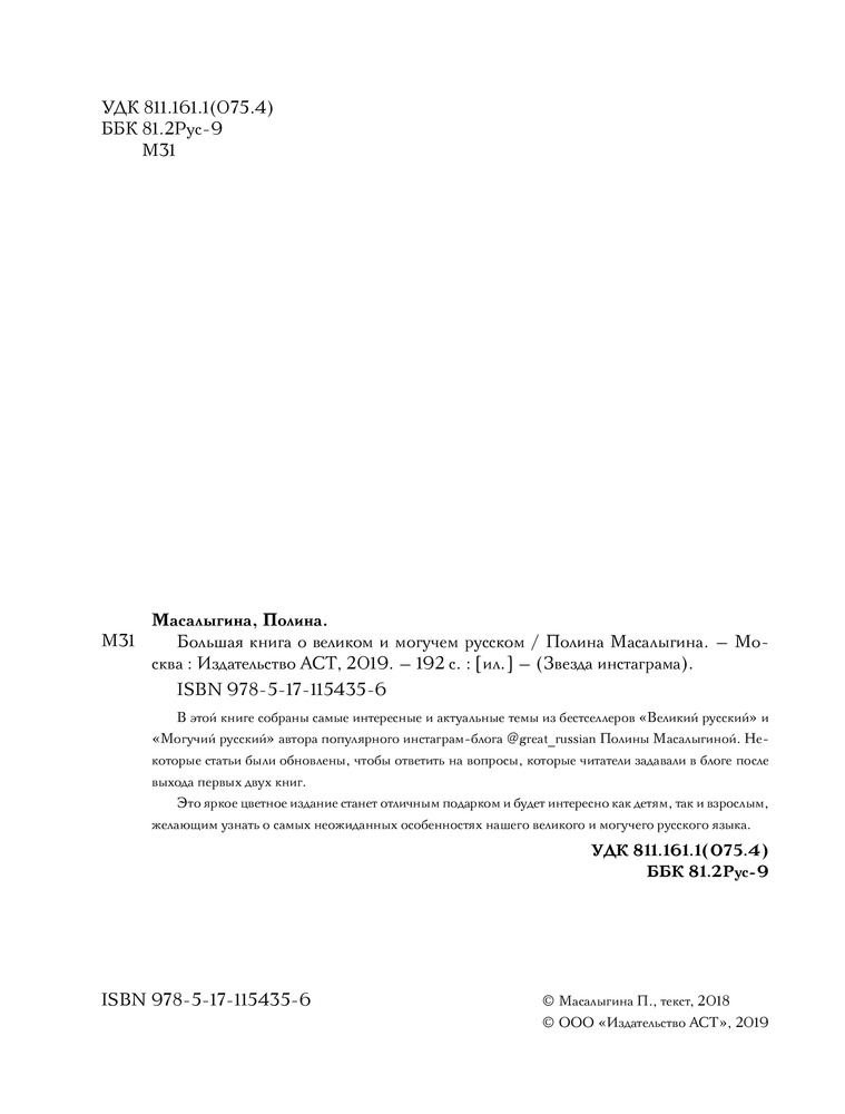 Большая книга о великом и могучем русскомВ данный момент этот товар отсутствует в продаже. Возможно, у нас найдется аналогичный или похожий товар здесь. Серия: Звезда инстаграма В этой книге собраны самые интересные и актуальные темы из бестселлеров «Великий русский» и «Могучий русский». Некоторые статьи были обновлены, чтобы ответить на вопросы, которые читатели задавали в блоге после выхода первых двух книг. Это яркое цветное издание станет отличным подарком и будет интересно как детям, так и взрослым, желающим узнать о самых неожиданных особенностях нашего великого и могучего русского языка. |