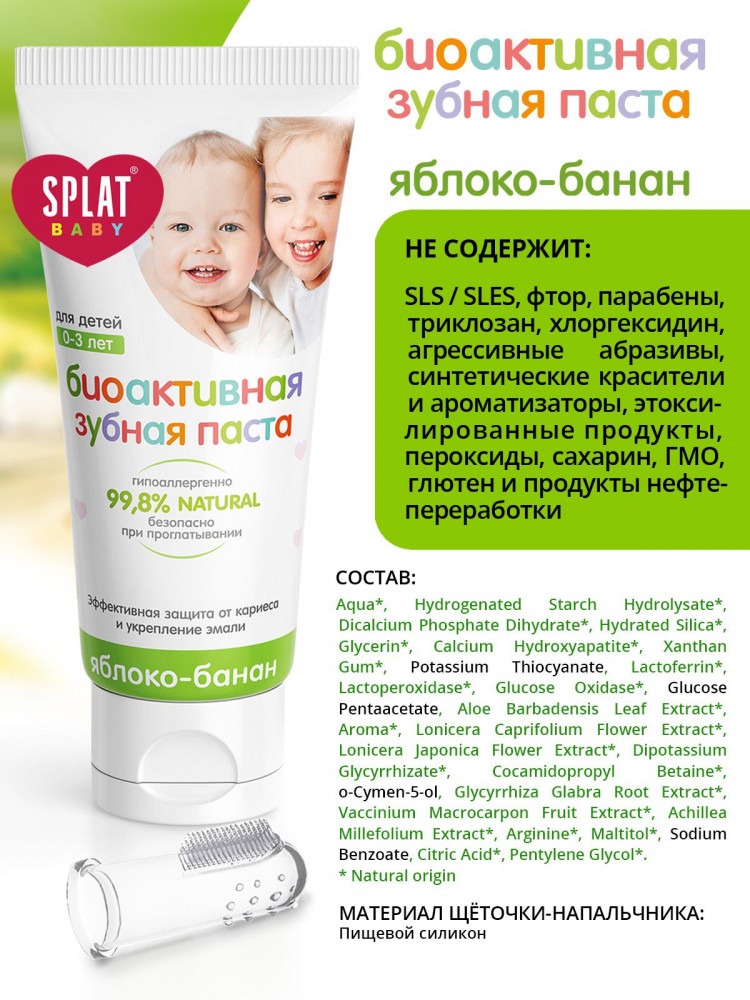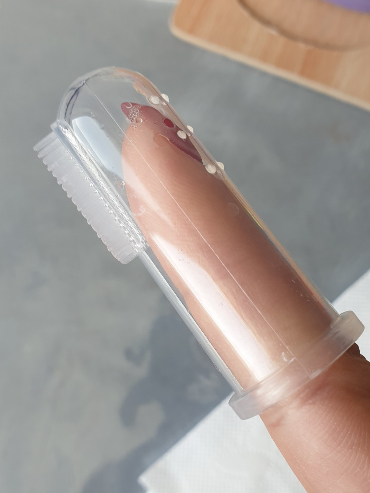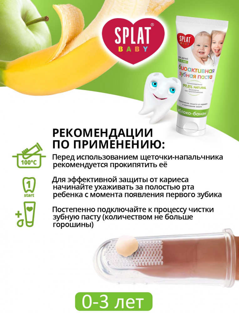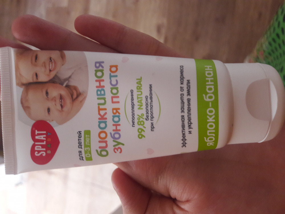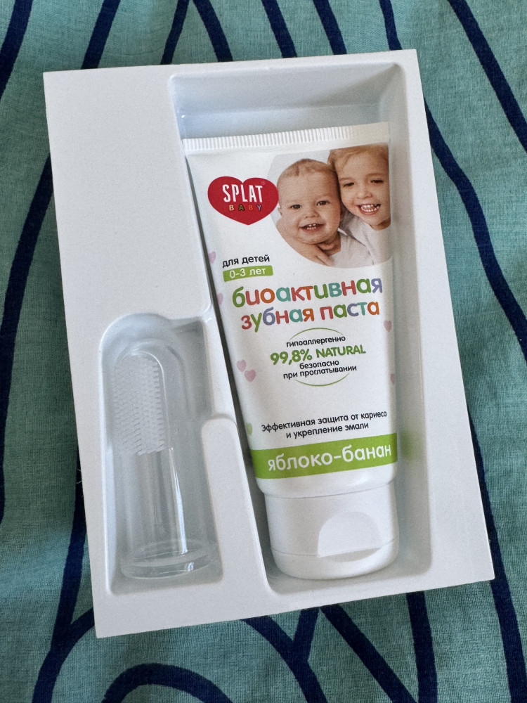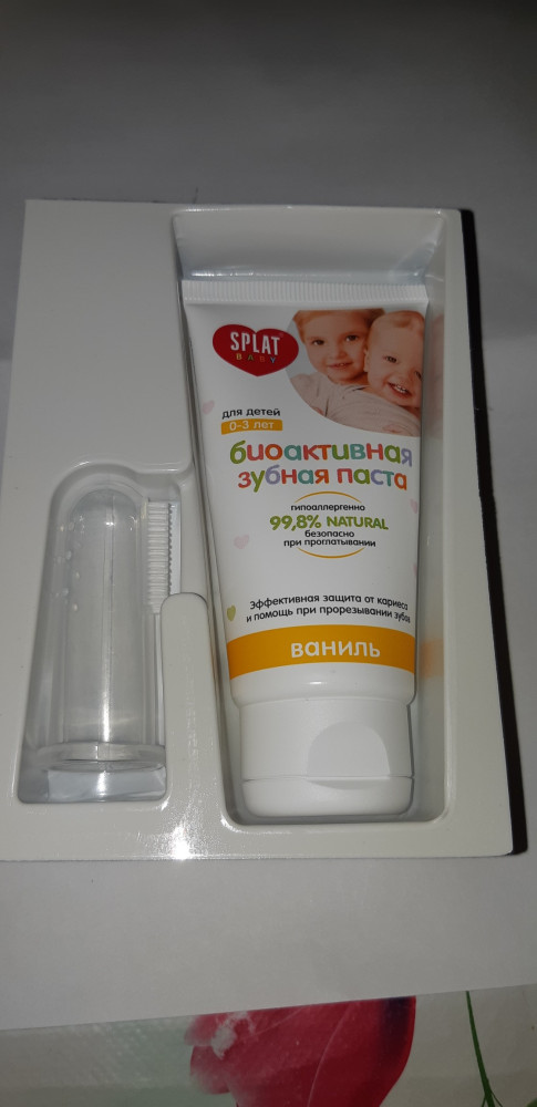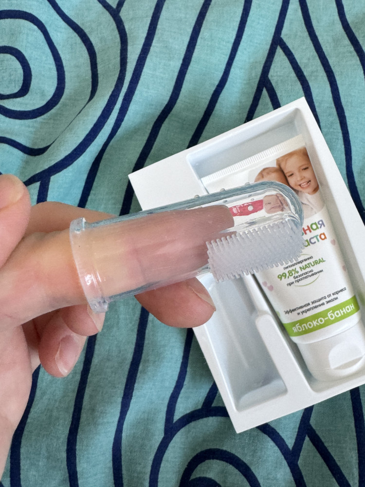 Паста отличная, вкус приятный, а щеточкой удобно зубки чистить, мой ребенок еще не понимает, зачем нужно все это, сопротивляется, а с такой щеткой удобно пролезть в рот и почистить, не повредив десна.