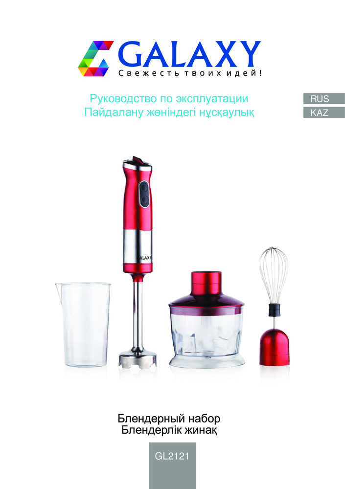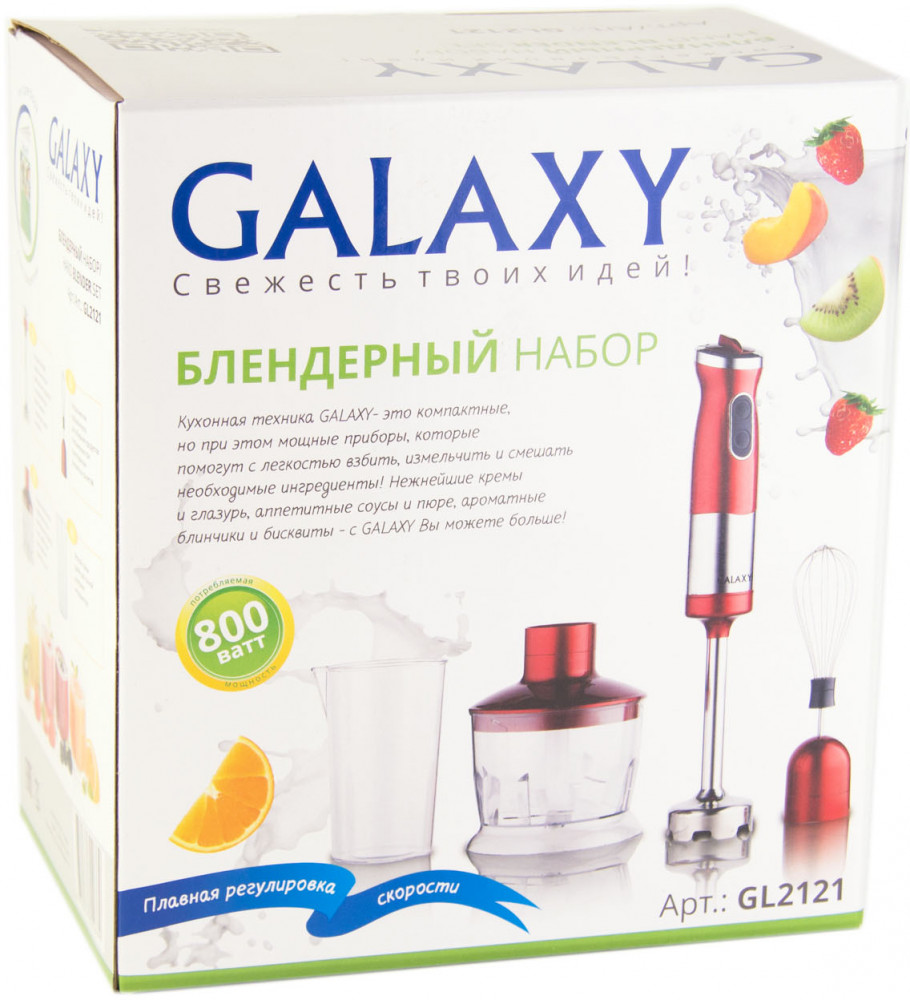 Блендерный набор Galaxy GL2121 включает в себя погружной блендер из нержавеющей стали, насадку-венчик, насадку-измельчитель с чашей 0,5 л и мерный стакан объемом 0,5 л. Наличие дополнительной насадки-венчика поможет вам быстро и качественно взбивает сливки, яйца, а также кремы и жидкое тесто. С помощью измельчителя вы сможете приготовить пюре или паштет, измельчить овощи для салата или супа, превратить мясо или рыбу в фарш.