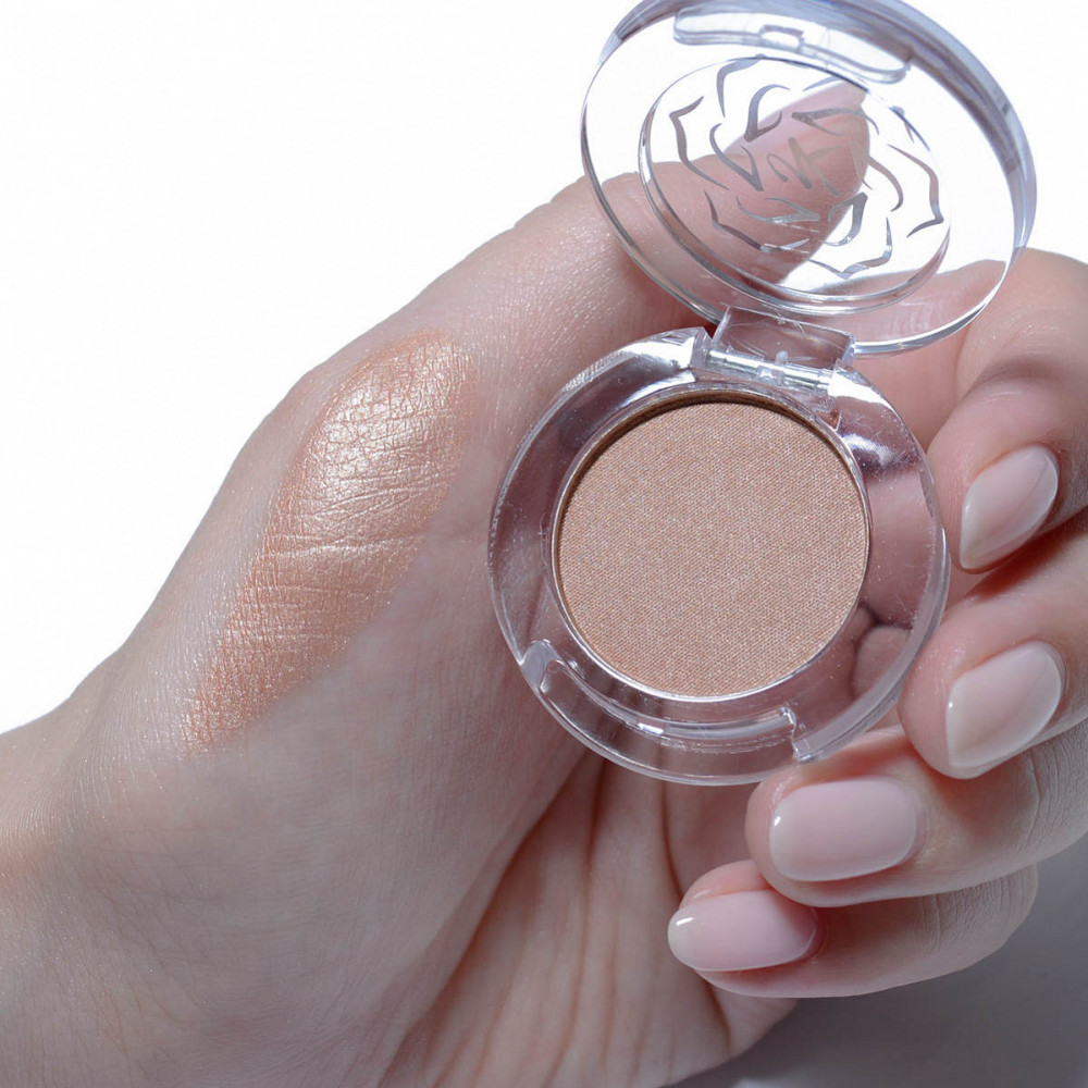 Тени маленькие, на ощупь чуть шершавые, не хватает им шелковистости. Дают слабое деликатное сияние, оттенок "ореховое пралине" имеет теплый коричневатый подтон, смотрится естественно, неброско.