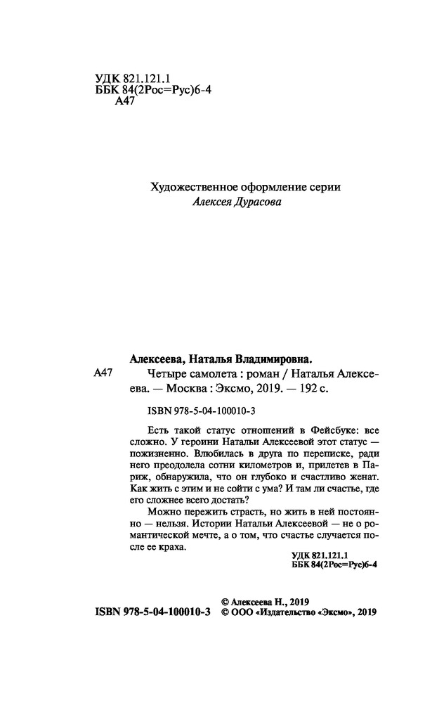 Четыре самолетаНаталья Владимировна Алексеева В данный момент этот товар отсутствует в продаже. Возможно, у нас найдется аналогичный или похожий товар здесь. Серия: Короткий метр. Русский рассказ Есть такой статус отношений в Фейсбуке: все сложно. У героини Натальи Алексеевой этот статус — пожизненно. Влюбилась в друга по переписке, ради него преодолела сотни километров и, прилетев в Париж, обнаружила, что он глубоко и счастливо женат. Как жить с этим и не сойти с ума? И там ли счастье, где его сложнее всего достать? |