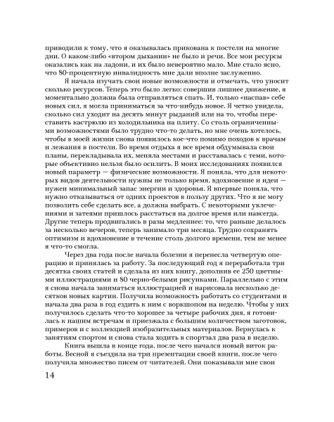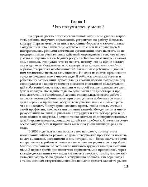 Сразу скажу, что отзыв на книгу очень субъективен. Людям строгим, организованным и склонным к жесткому планированию она, может быть, и будет полезна, но интересна - едва ли. А вот тем, кто склонен к прокрастинации и самооправданиям - вполне! Книга - хороший толчок для начала перемен. Вечность он не работает, конечно, но его интенсивность со временем не снижается. Перечитывала несколько раз, каждый раз получая волшебный пендель. Яна Франк делится не выкопанной в интернетах панацеей, которая за один день превратит вашу жизнь в рай! Она делится личным опытом, который помог ей добиться хороших результатов в организации и планировании. Даёт советы, а не указания. Сама же объясняет, почему тот или иной совет может быть не применим конкретно в вашем случае. Фактически - даёт ключи, а как их использовать - дело ваше. Половина книги - ежедневник, построенный по её методике (в полном варианте доступен под названием "365 дней творческого человека", на Флипе тоже есть). Что понравилось отдельно - она учит книги читать. Читать правильно :) Исполнение самой книги тоже отличное. Листы плотные и белые, грамотный текст, качественные иллюстрации. Здесь вообще претензий нет. Рекомендую. На мой взгляд - книга стоит вкладываемых денег.