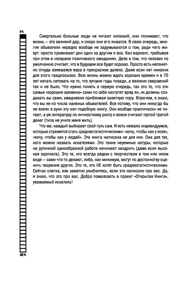 Серия: Звезда соцсети. Подарочное издание «Открытая Книга» — совершенно уникальный проект по саморазвитию. Эта книга разительно отличается от всего, что издано ранее. К примеру, у нее нет первой стороны обложки (и поэтому ее нельзя закрыть) и ее нужно скорее не читать, а «проходить» (делать это нужно, кстати, ровно 60 дней — не быстрее и не медленнее). Есть связанная концепция, поделенная на блоки. Каждый из дней читатель получает теоретическую подготовку и практическое задание, которое следует сделать. Ему нужно подтверждать факты выполнения упражнений. Судьей здесь является не автор (о котором, кстати, вообще ничего не известно), а другие читатели «Открытой Книги». Это произведение для тех, кто живет по накатанной уже давно и мечтает, чтобы в жизни случилось приключение, которое выбьет из тягучего равновесия, а также заставит работать над собой. |