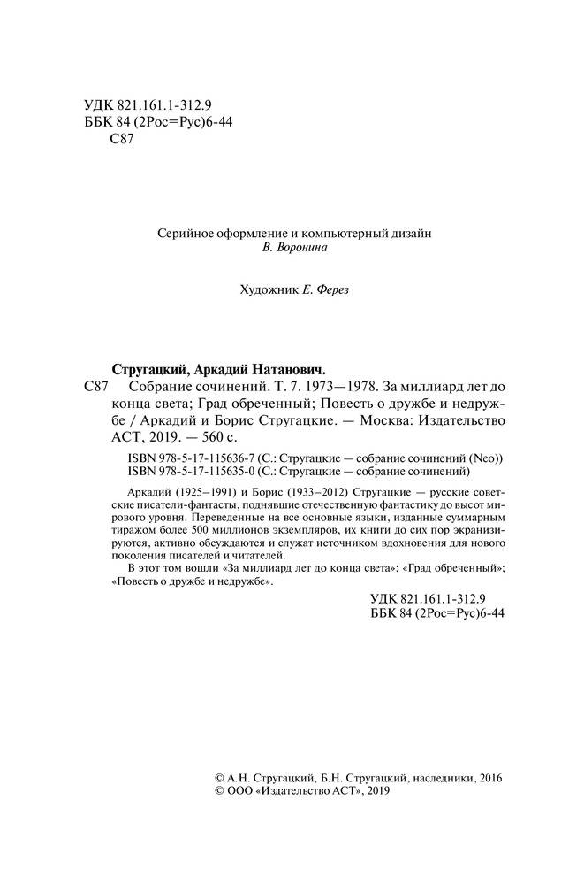 Серия: Стругацкие - собрание сочинений (Neo) Аркадий (1925–1991) и Борис (1933–2012) Стругацкие — русские советские писатели-фантасты, поднявшие отечественную фантастику до высот мирового уровня. Переведенные на все основные языки, изданные суммарным тиражом более 500 миллионов экземпляров, их книги до сих пор экранизируются, активно обсуждаются и служат источником вдохновения для нового поколения писателей и читателей. |