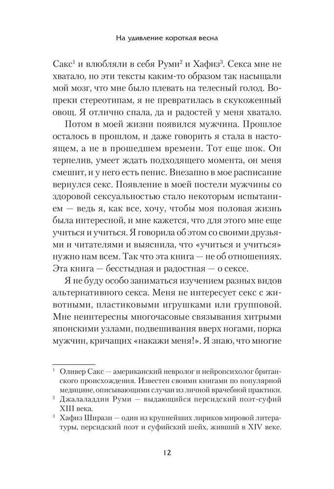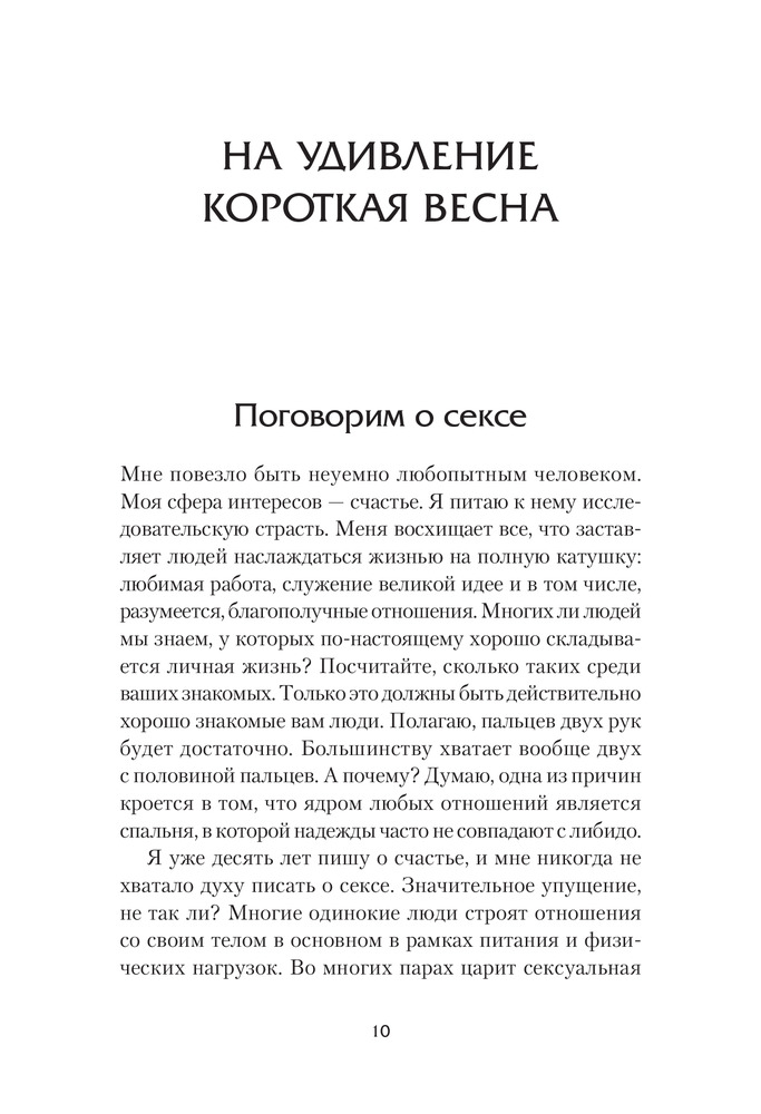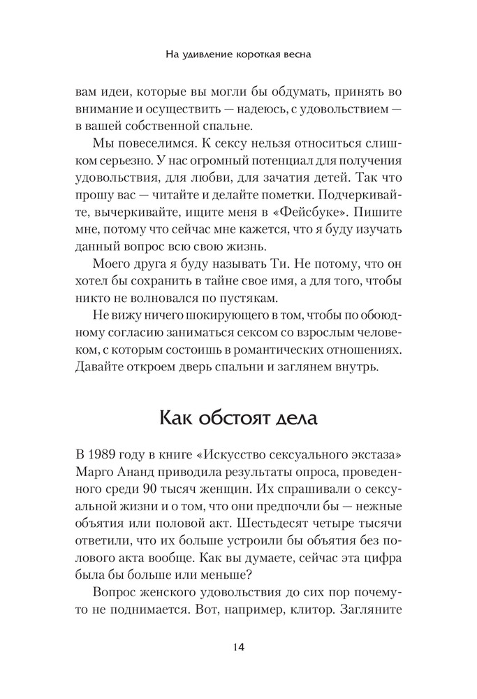 Sensation. Кому он нужен, этот сексВ данный момент этот товар отсутствует в продаже. Возможно, у нас найдется аналогичный или похожий товар здесь. Серия: Сам себе психолог В голове почти каждой женщины мелькала мысль: «Со мной что-то не так?» «Секс без оргазма тоже неплох». «Зато у меня есть мужчина, а у других вообще никакого». Изабель Лосада решила не уповать на судьбу и отправилась на поиски. На поиски не идеального мужчины, как советуют модные журналы и психологи, а истоков сексуальности. От имени всех женщин, за короткую весну, жаркое лето, осень в багряных тонах и уютную зиму, она посетила маленькие семинары и популярные тренинги, провела интервью с коучами и даже попала на Первую международную клиторальную конференцию. Узнала об одиннадцати формах оргазма, — десять из которых не испытывала, — а также о специальных упражнениях, техниках и приемах, которые помогают раскрепоститься и выйти на новый уровень блаженства. Она уверена — каждая женщина может открыть новые горизонты и познать себя, ведь в сексе нет никаких запретов, наоборот — это увлекательно, интересно, прекрасно и в какой-то степени даже весело.Sensation — это история путешествия, после которого не останется вопроса «Кому он нужен, этот секс?» |