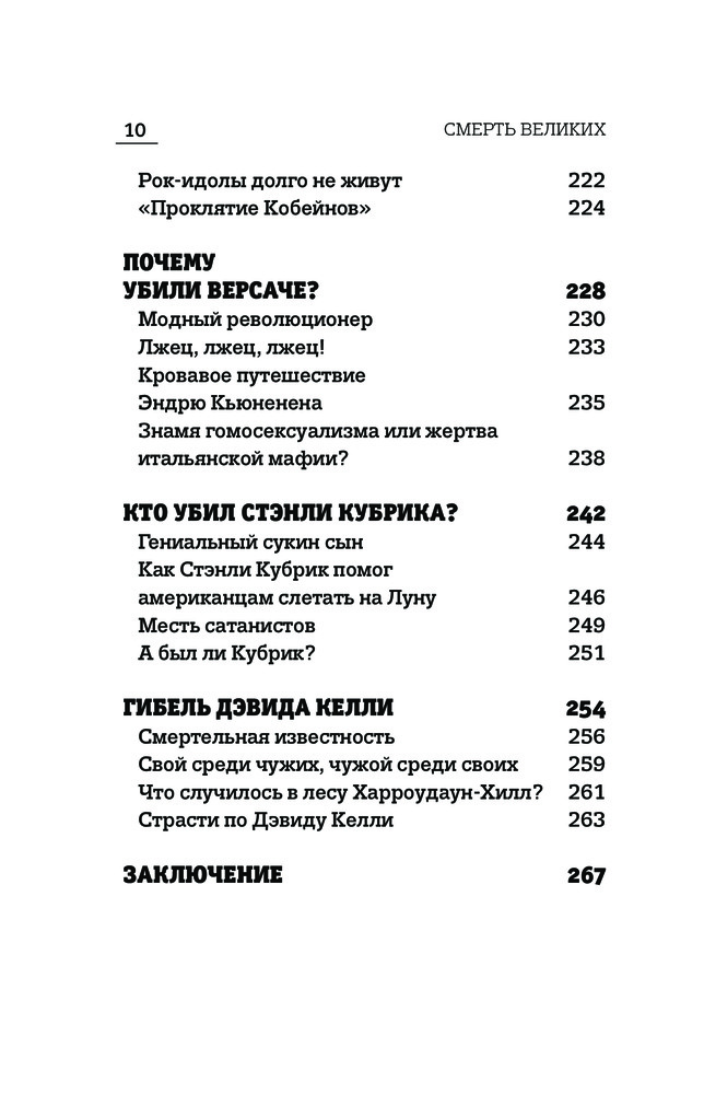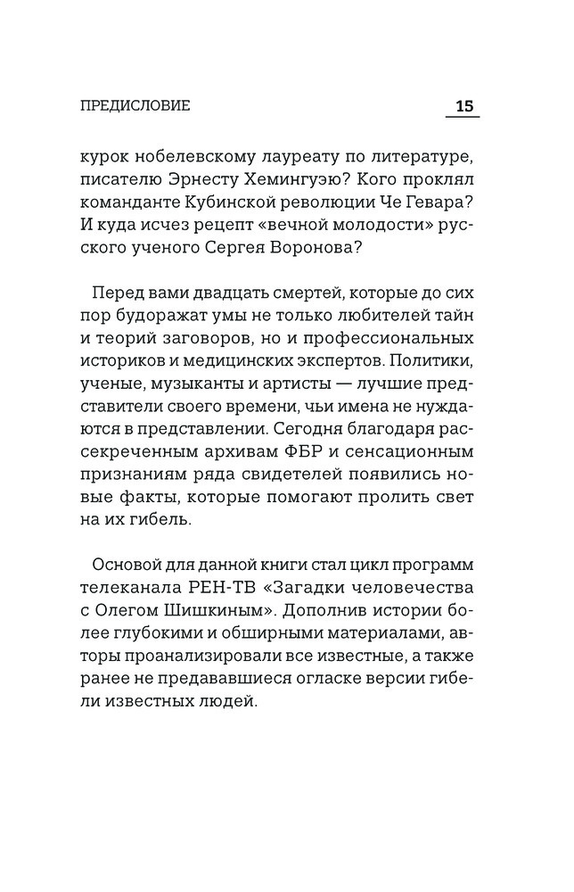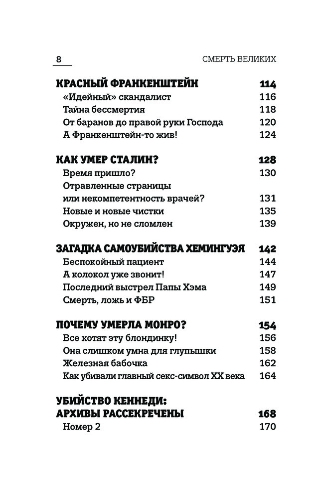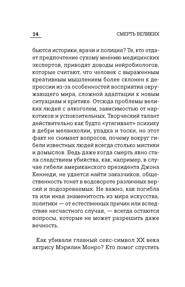 Двадцать смертей, которые до сих пор будоражат умы не только любителей тайн и теорий заговоров, но и профессиональных историков и медицинских экспертов. Политики, ученые, музыканты и артисты — лучшие представители своего времени, чьи имена не нуждаются в представлении. Сегодня благодаря рассекреченным архивам ФБР и сенсационным признаниям ряда свидетелей появились новые факты, которые помогают пролить свет на их гибель. |