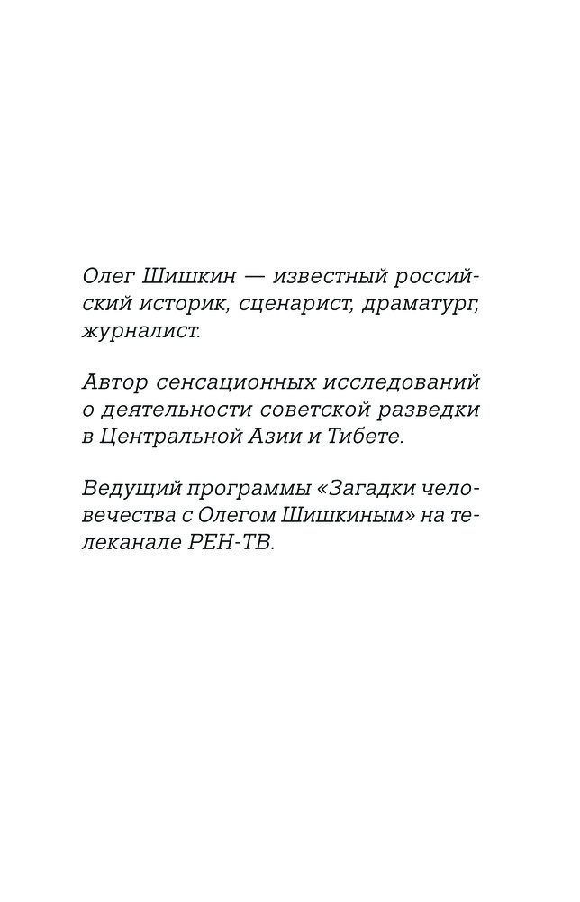 В данный момент этот товар отсутствует в продаже. Возможно, у нас найдется аналогичный или похожий товар здесь. Серия: Загадки человечества с Олегом Шишкиным Олег Шишкин — известный российский историк, сценарист, драматург, журналист. Автор сенсационных исследований о деятельности советской разведки в Центральной Азии и Тибете. Ведущий популярной программы «Загадки человечества с Олегом Шишкиным» на телеканале РЕН-ТВ.