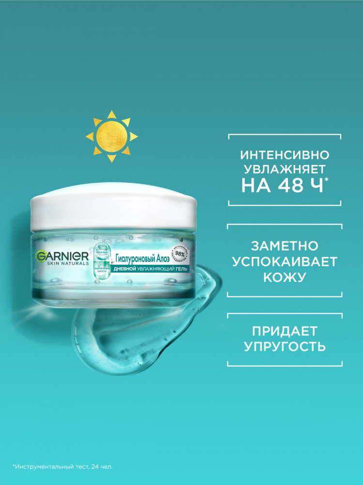 Серия: Skin Naturals Гиалуроновый Алоэ-гель Garnier для лица поддерживает интенсивное увлажнение в течение 48 часов, освежает, придает коже упругость и сияние. Состав средства включает 96% ингредиентов натурального происхождения. |