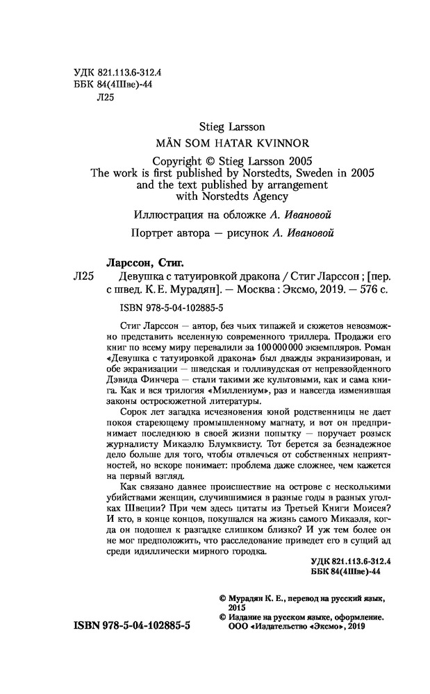 💳 Оплатить за товар можно при получении 🇰🇿 Есть бесплатная доставка по Казахстану 🎁 Копите бонусы с каждой покупки Серия: Крафтовый детектив из Скандинавии. Только звезды Стиг Ларссон — автор, без чьих типажей и сюжетов невозможно представить вселенную современного триллера. Продажи его книг по всему миру перевалили за 100 000 000 экземпляров. Роман «Девушка с татуировкой дракона» был дважды экранизирован, и обе экранизации — шведская и голливудская от непревозойденного Дэвида Финчера — стали такими же культовыми, как и сама книга. Как и вся трилогия «Миллениум», раз и навсегда изменившая законы остросюжетной литературы. Сорок лет загадка исчезновения юной родственницы не дает покоя стареющему промышленному магнату, и вот он предпринимает последнюю в своей жизни попытку — поручает розыск журналисту Микаэлю Блумквисту. Тот берется за безнадежное дело больше для того, чтобы отвлечься от собственных неприятностей, но вскоре понимает: проблема даже сложнее, чем кажется на первый взгляд. |