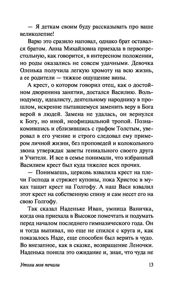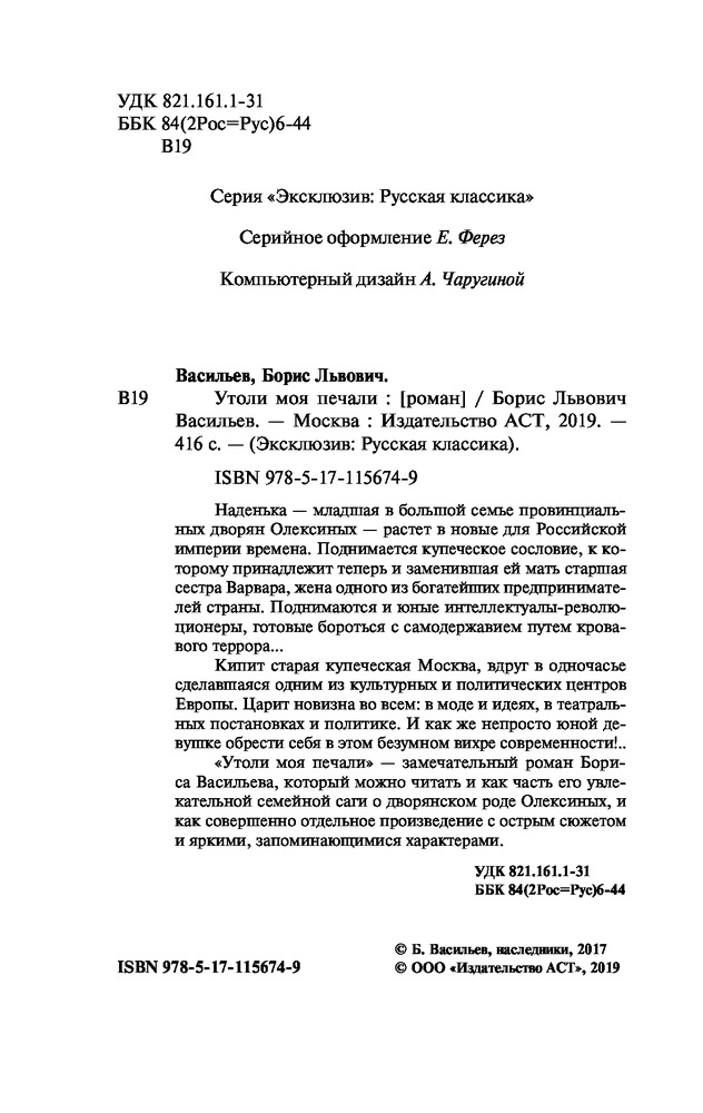 Серия: Эксклюзив: Русская классика Наденька — младшая в большой семье провинциальных дворян Олексиных — растет в новые для Российской империи времена. Поднимается купеческое сословие, к которому принадлежит теперь и заменившая ей мать старшая сестра Варвара, жена одного из богатейших предпринимателей страны. Поднимаются и юные интеллектуалы-революционеры, готовые бороться с самодержавием путем кровавого террора... Кипит старая купеческая Москва, вдруг в одночасье сделавшаяся одним из культурных и политических центров Европы. Царит новизна во всем: в моде и идеях, театральных постановках и политике. И как же непросто юной девушке обрести себя в этом безумном вихре современности!.. «Утоли моя печали» — замечательный роман Бориса Васильева, который можно читать и как часть его увлекательной семейной саги о дворянском роде Олексиных, и как совершенно отдельное произведение с острым сюжетом и яркими, запоминающимися характерами. |