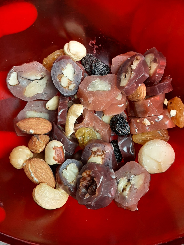 Полностью согласна с Татьяной. Брала тоже со скидкой, дороговато. Заказывала, только что бы попробовать пекан и макадамия, тоже 1/3 изюма (но вкусный), 3 макадамии вкус не понятен, 4,5 пекана вкус грец.ореха, по чуток фундук, миндаль, кешью. Все орешки нормальные, не горькие. На фото орехи и чурчхела из грец.ореха.