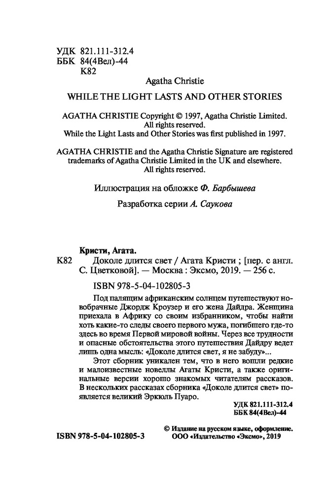 Этот сборник уникален тем, что в него вошли редкие и малоизвестные новеллы Агаты Кристи, а также оригинальные версии хорошо знакомых читателям рассказов. В нескольких рассказах сборника «Доколе длится свет» появляется великий Эркюль Пуаро.  |