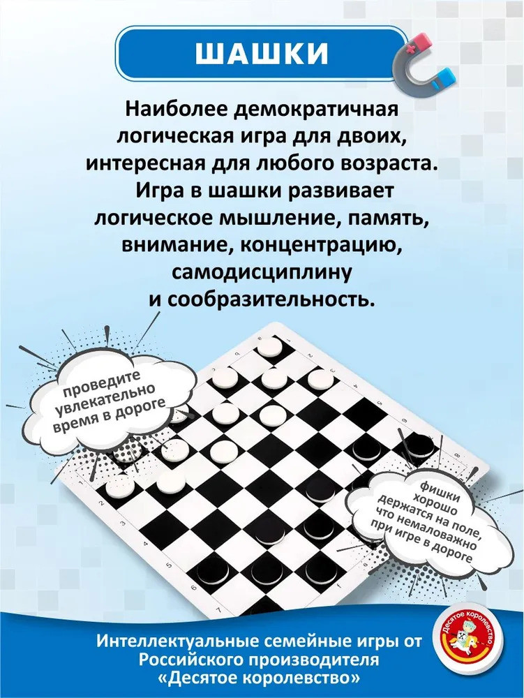Серия: Игры в дорогу Перед вами игра, где магнитные фишки и элементы фиксируются не на экране из жести, а на мягком поле, обклеенным с двух сторон тонким картоном: с одной стороны — поле предназначено для игры в шахматы и шашки, а с другой — для игры в Словодел. Фишки к игре изготовлены из мягкого безопасного полимерного материала с магнитным основанием для крепления.