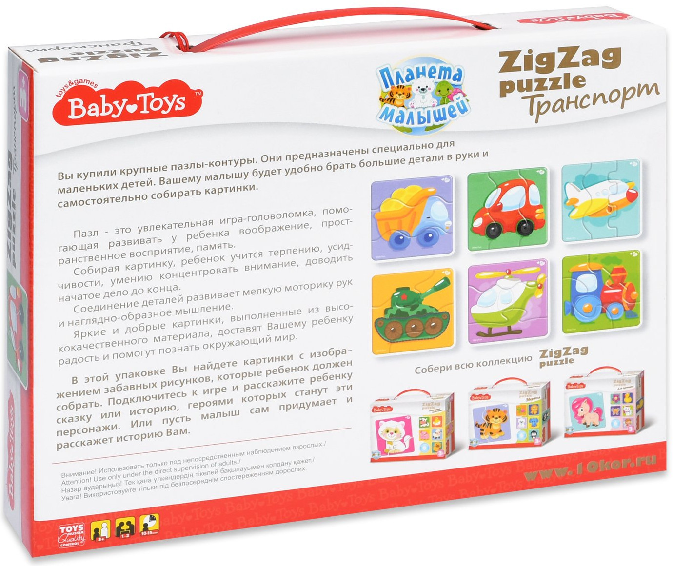 Серия: ZigZag puzzle Пазлы «Транспорт» от российской компании «Десятое королевство» помогут ребенку увлекательно провести время, собирая красочные цветные картинки с изображением разного вида транспорта. Дети получат приятные эмоции от игры, радуясь своим успехам и красивым машинкам, самолетикам и паровозикам. |