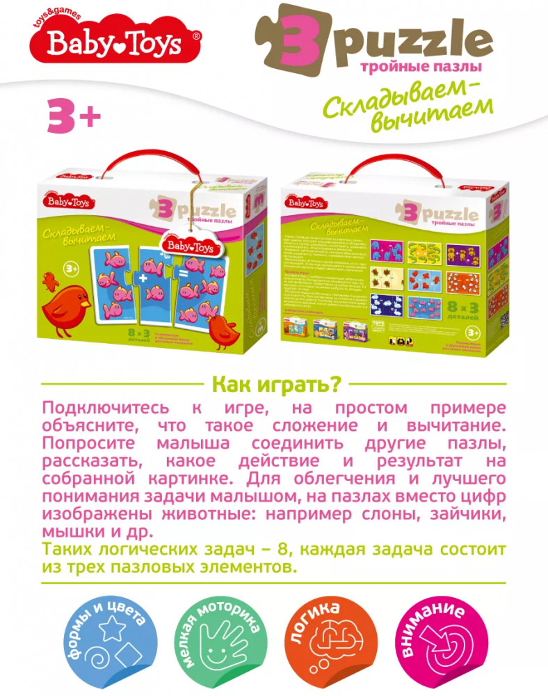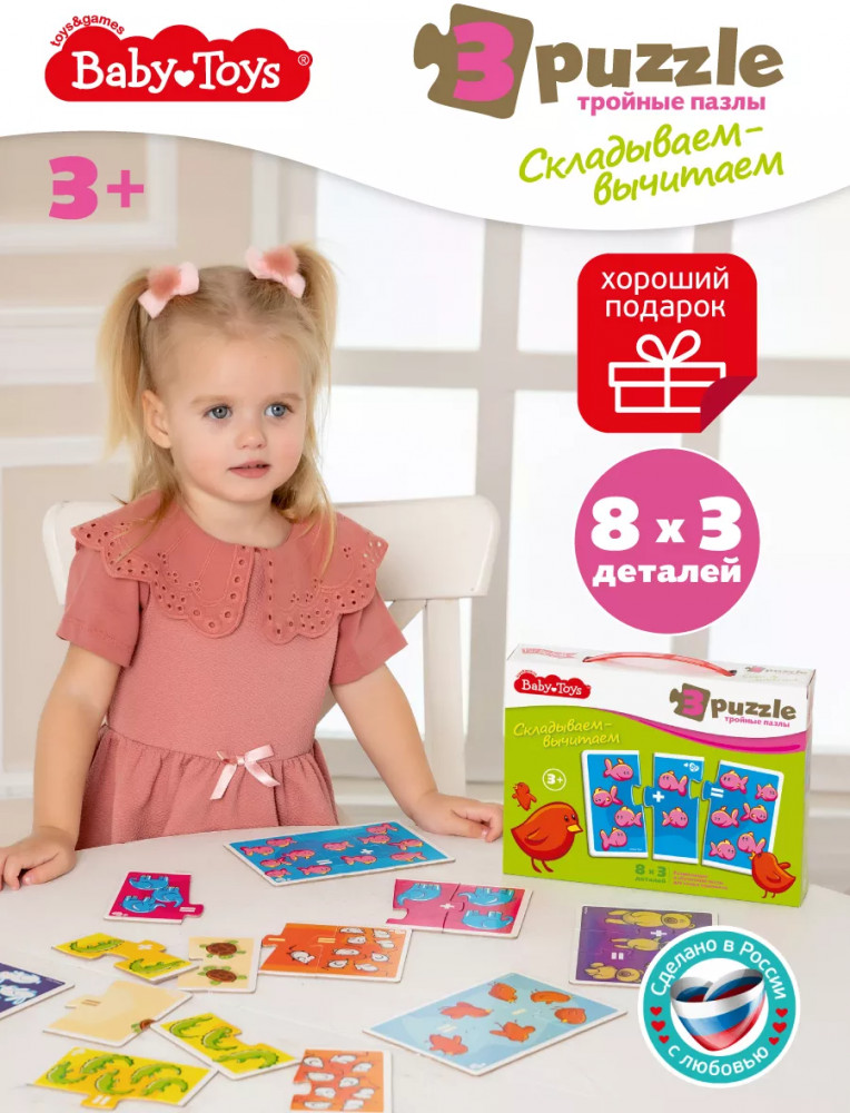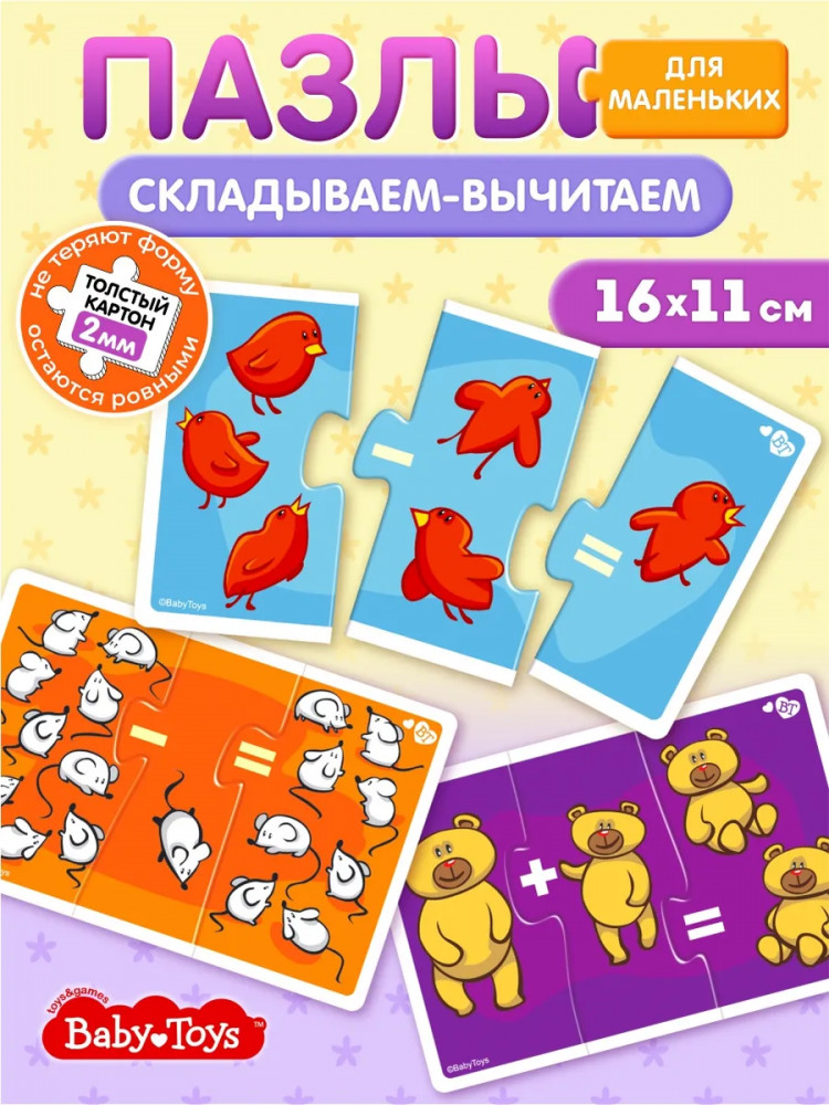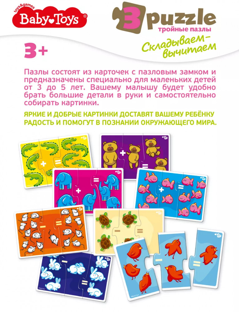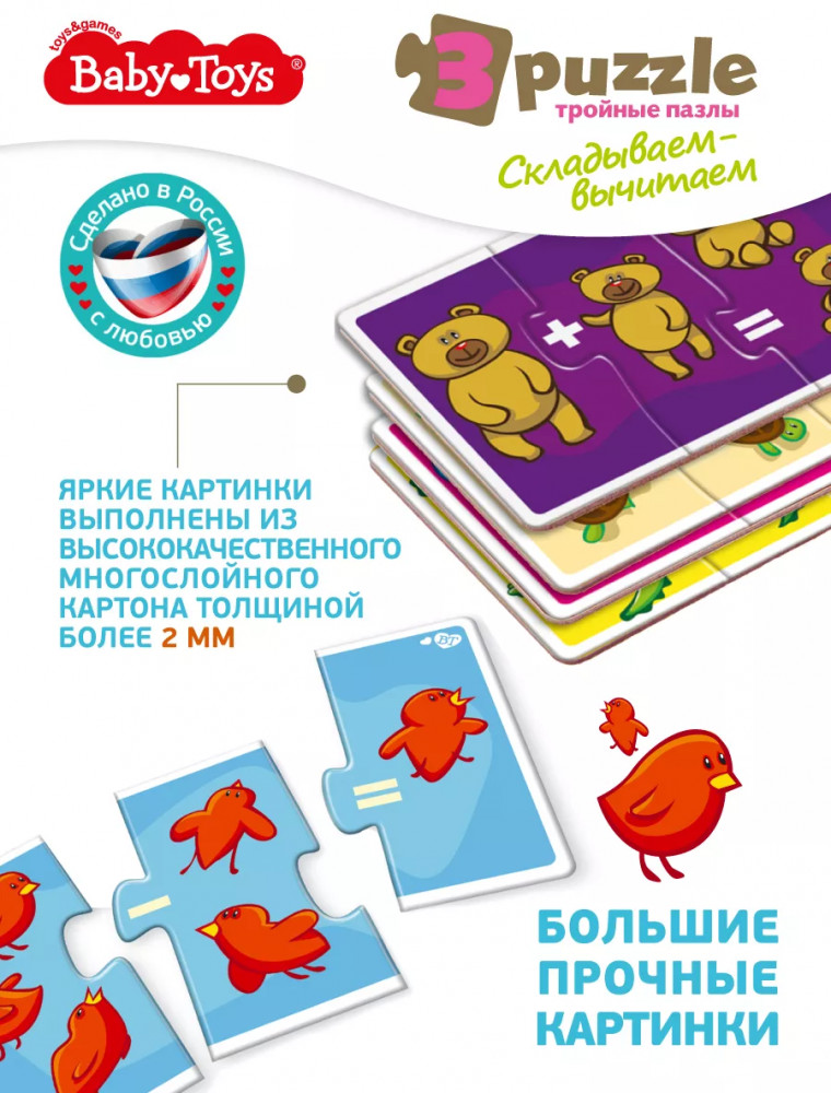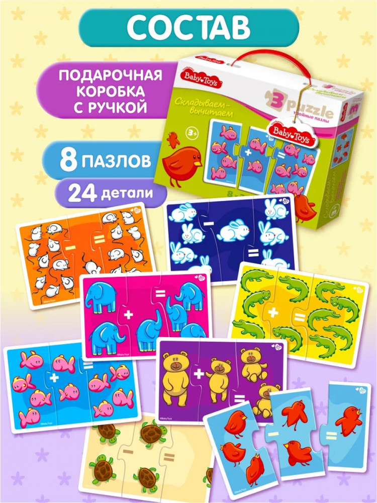 Серия: Тройные пазлы Замечательный набор представлен красочными деталями из плотного картона, благодаря которому ребенок сможет поупражняться в решении логических задач на сложение и вычитание. Вместо цифр на картинках изображены забавные зверушки. Обучение в процессе увлекательной игры, даст эффективный результат. |